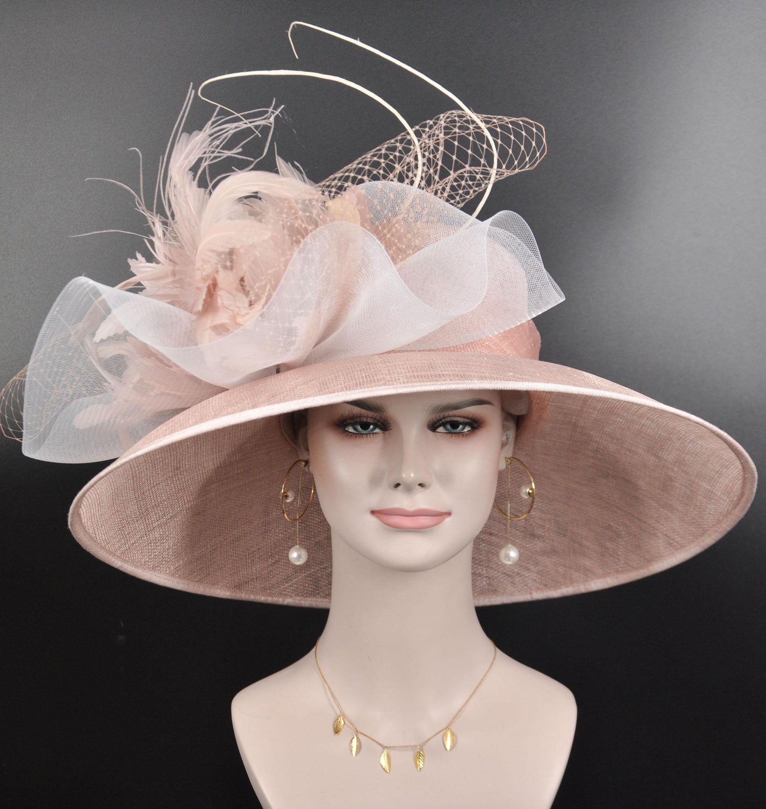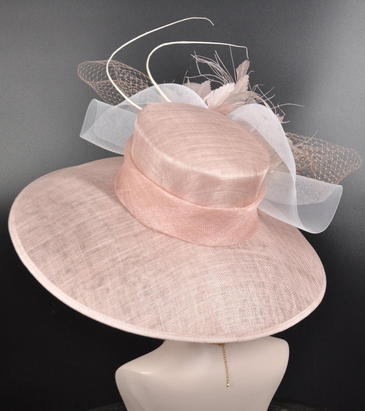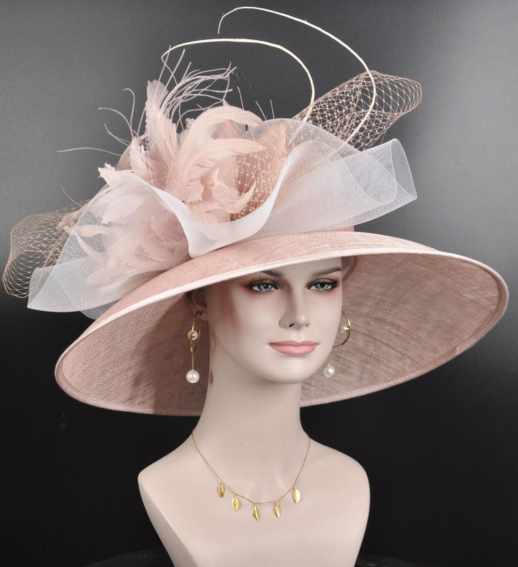 Church Kentucky Derby Hat Carriage Tea Party Wedding Feather Flowers Jumbo Bows and Ostrich Quills Dusty /Blush Pink w White