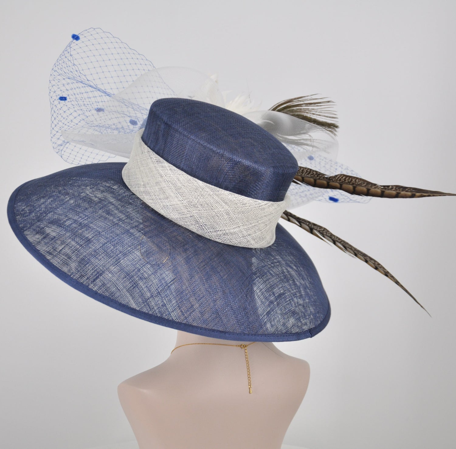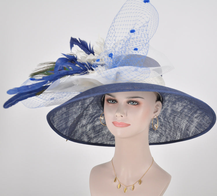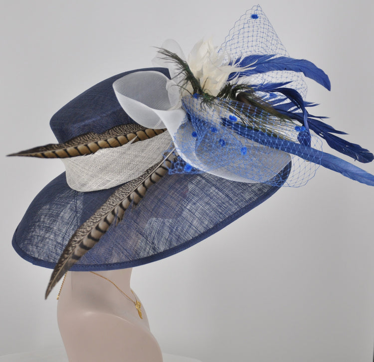 Church Kentucky Derby Hat Carriage Tea Party Wedding Navy Blue w White Flower Peacock Feathers