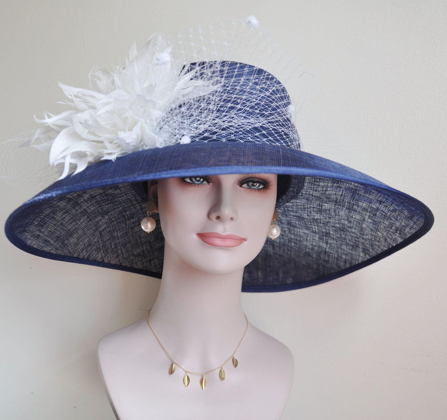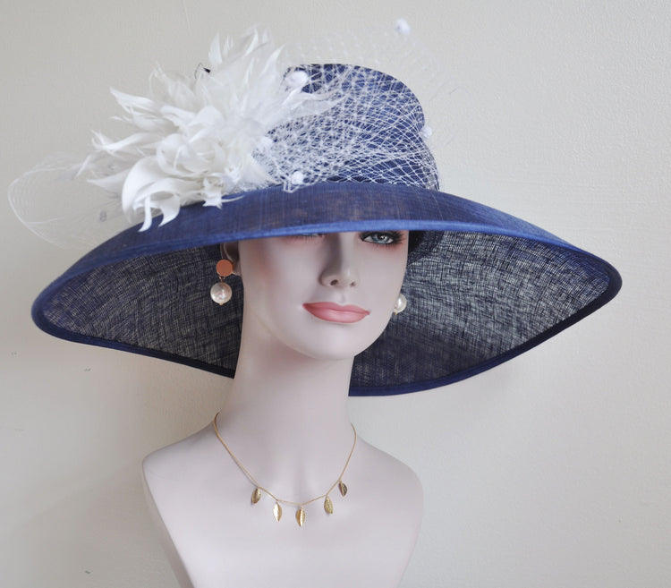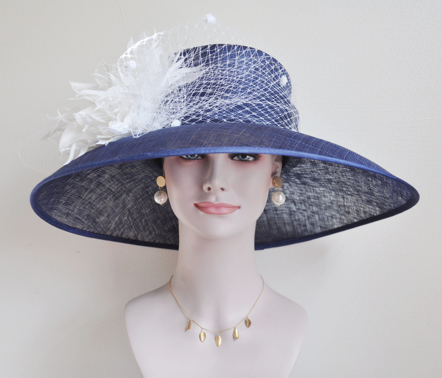 Church Kentucky Derby Hat Carriage Tea Party Wedding Wide Brim Royal Ascot Hat in Solid Sinamay Hat Navy Blue w Ivory
