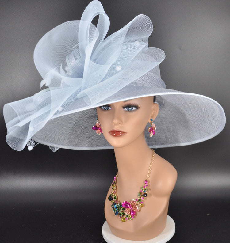 Church Kentucky Derby Hat Carriage Tea Party Wedding Wide Brim Royal Ascot Horse Race Oaks day hat Light Blue/Powder Blue Derby Hat