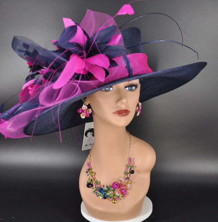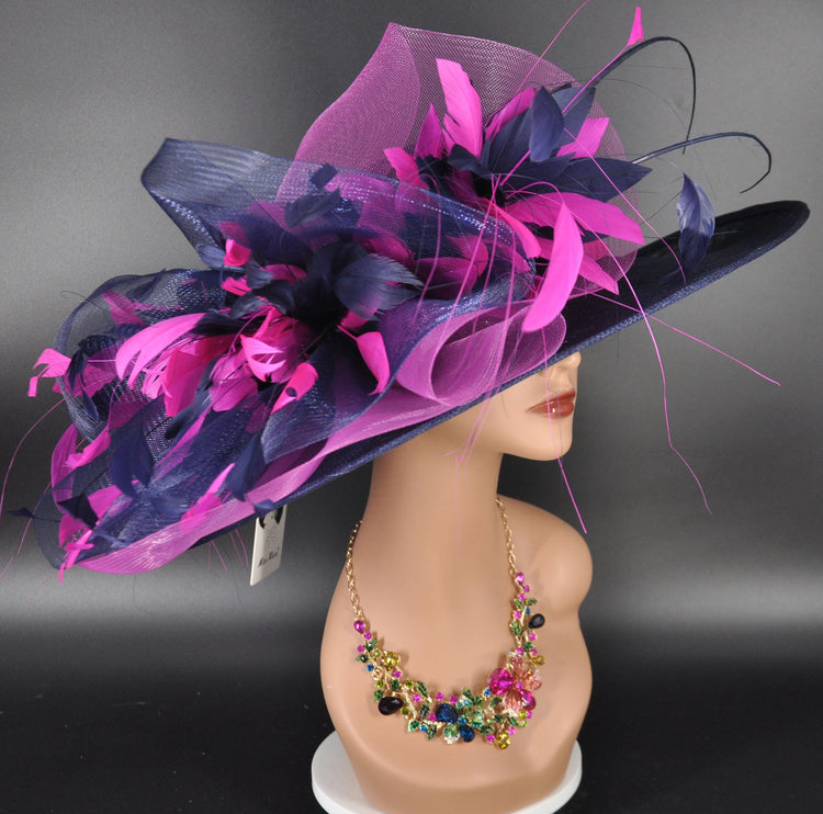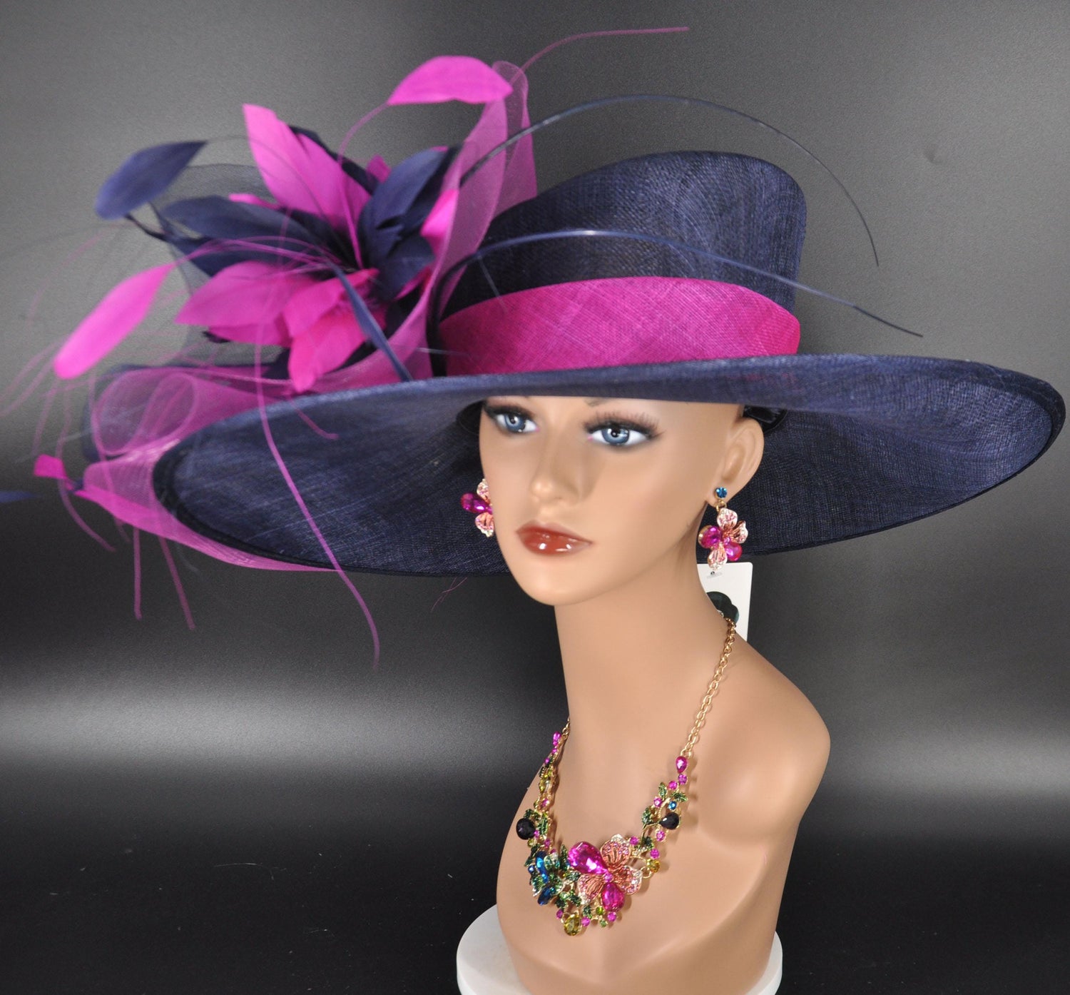 Church Kentucky Derby Hat Carriage Tea Party Wedding Wide Brim Sinamay Hat Navy Blue Fuchsia Pink
