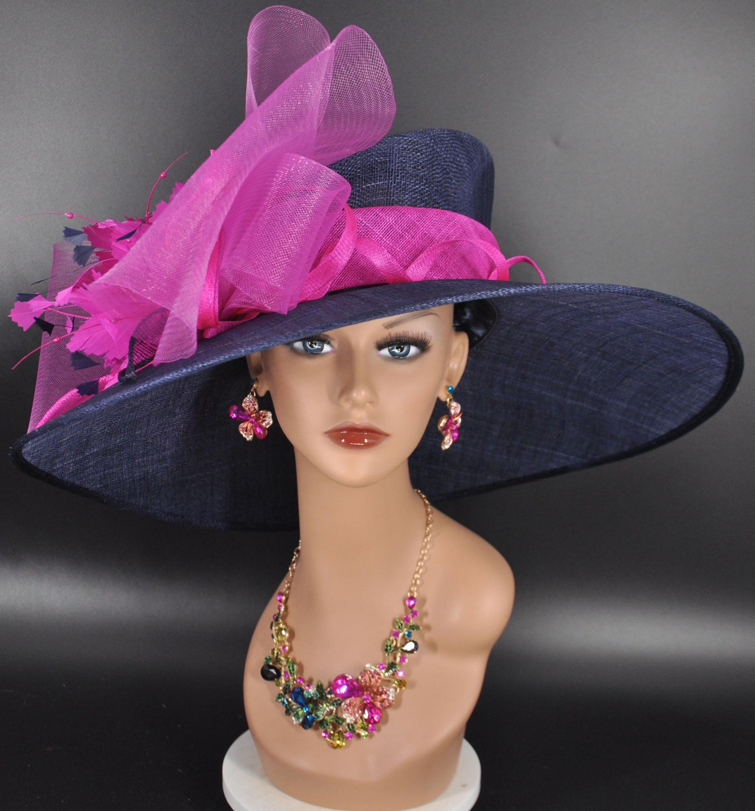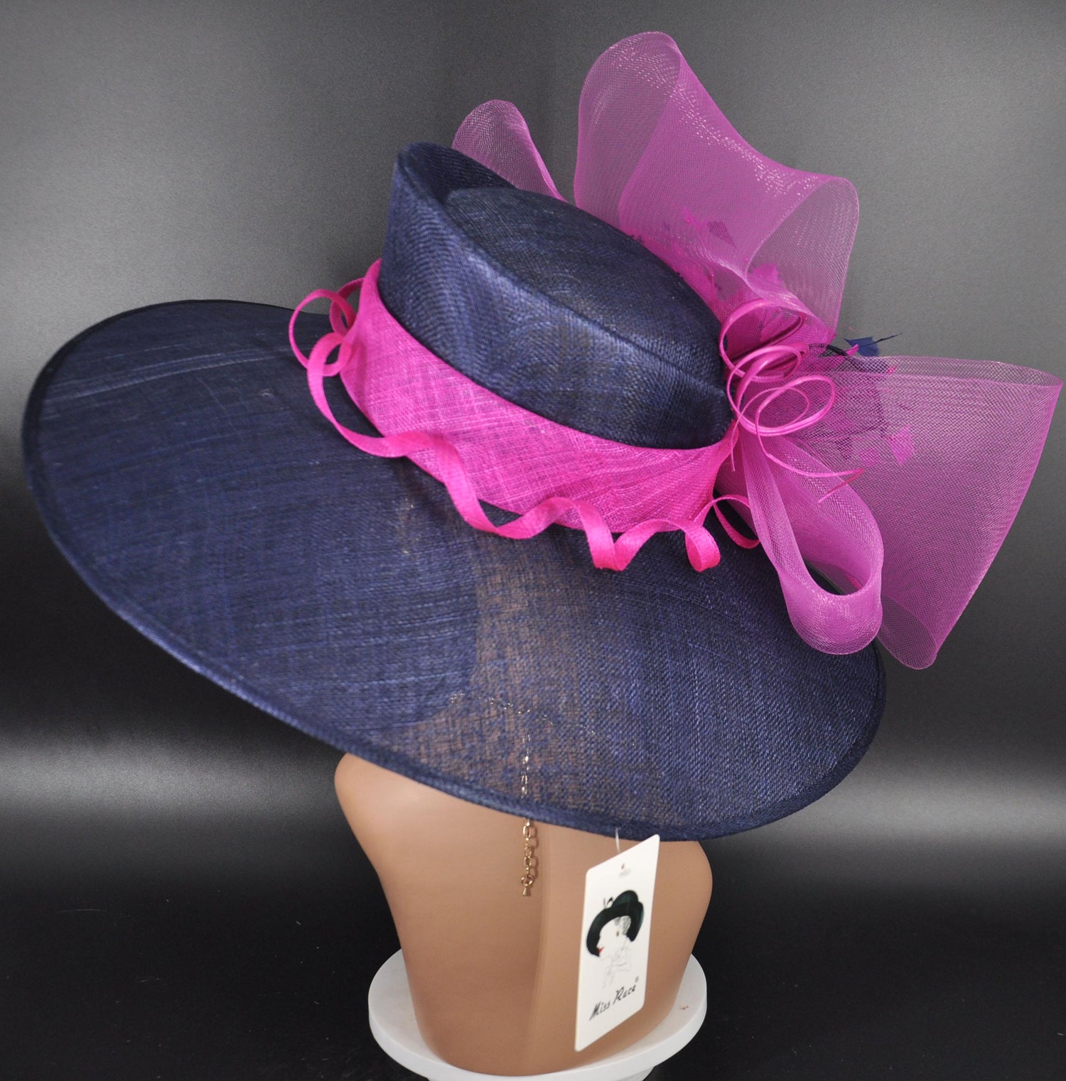 Church Kentucky Derby Hat Carriage Tea Party Wedding Wide Brim Sinamay Hat Navy Blue w fuchsia Pink