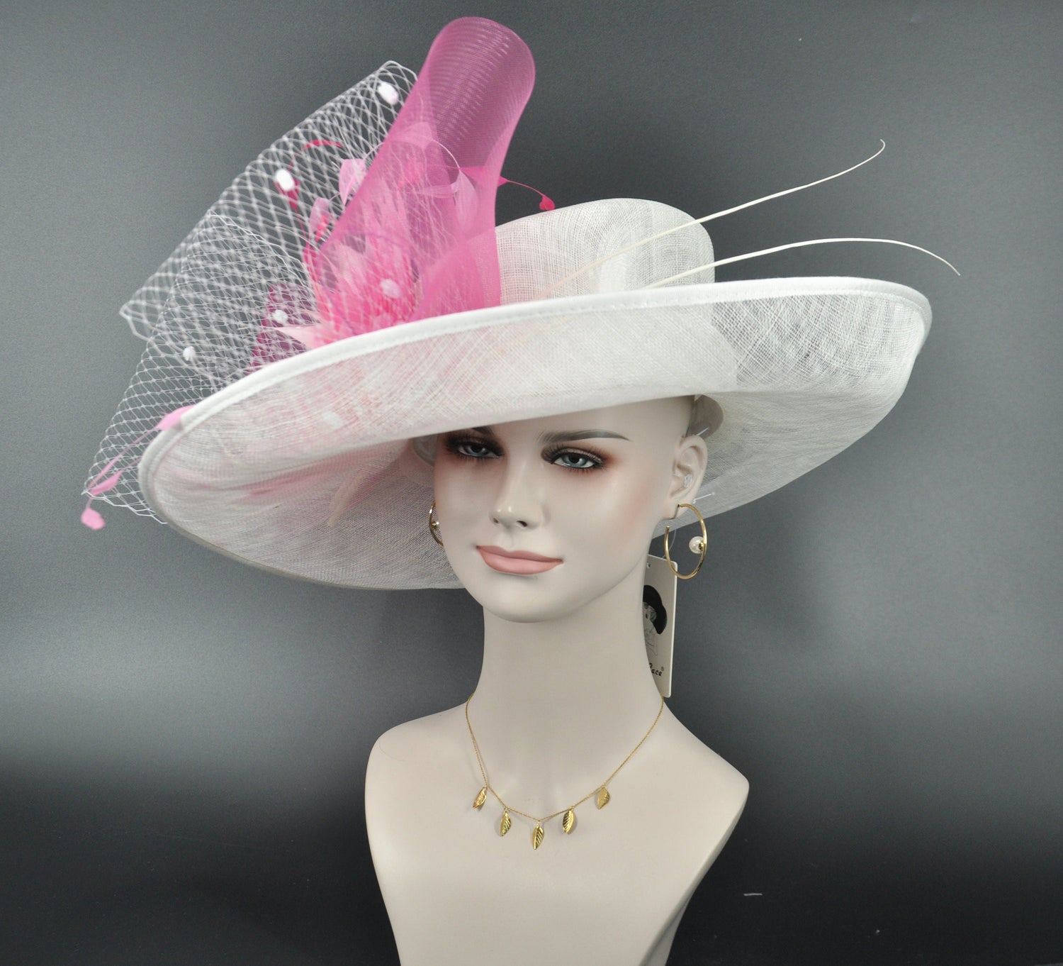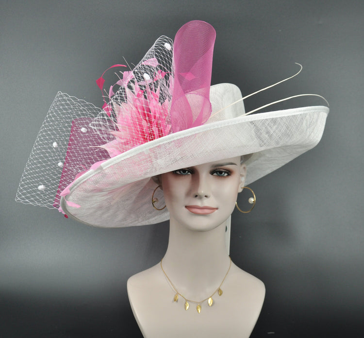 Church Kentucky Derby Hat Carriage Tea Party Wedding Wide Brim Sinamay Hat White w Fuchsia Hot Pink Pink Feather Flower Bows