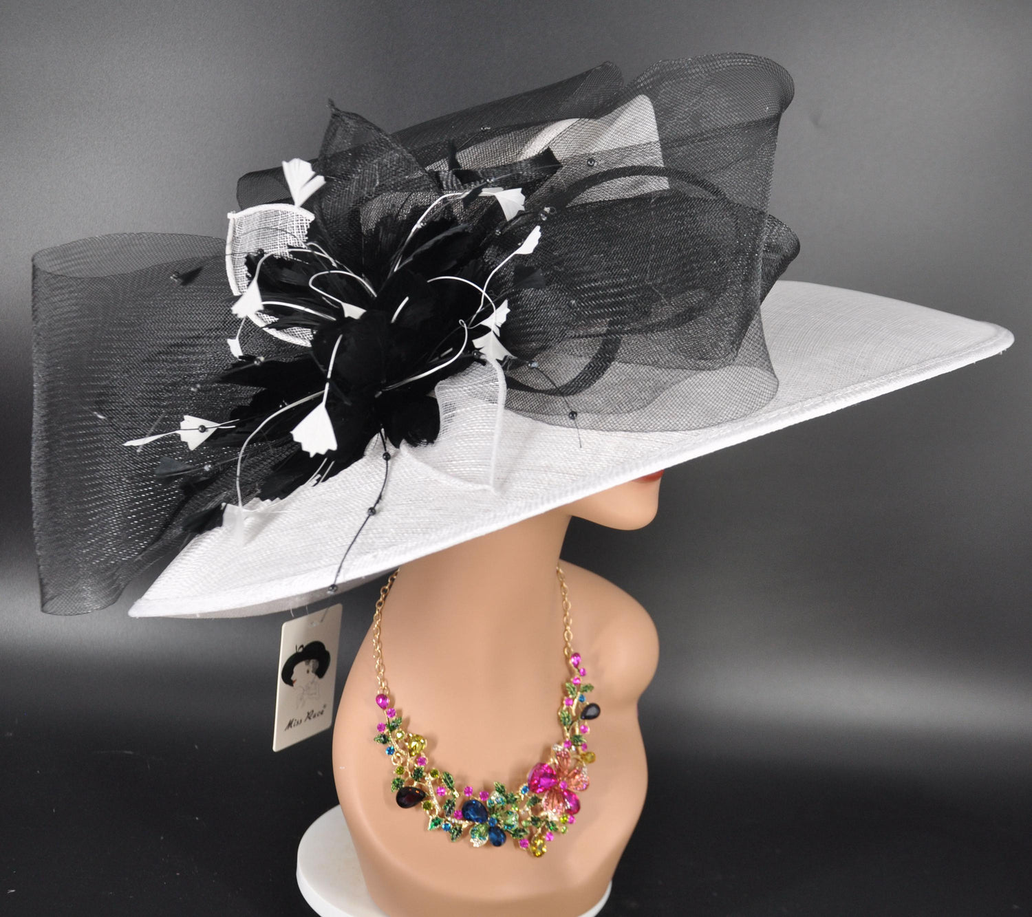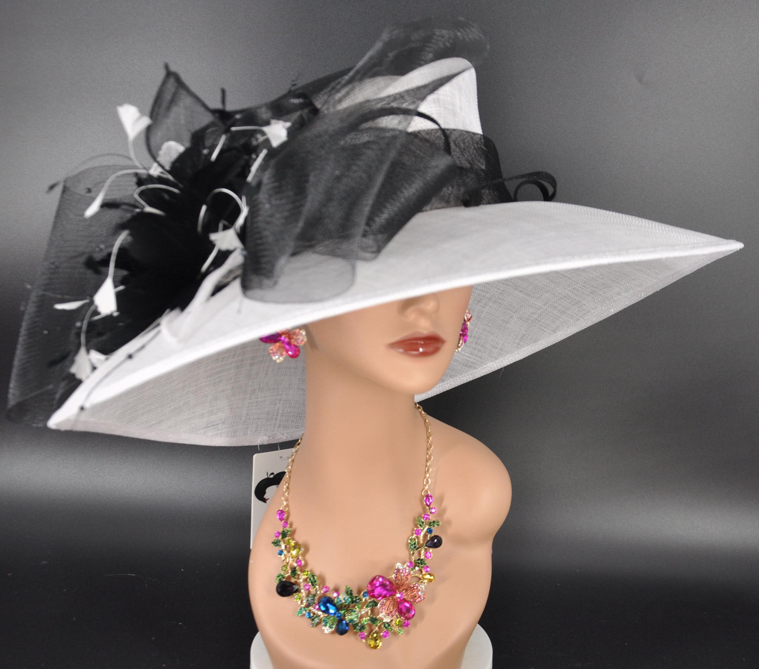 Church Kentucky Derby Hat Carriage Tea Party Wedding Wide Brim Sinamay Hat White with Black