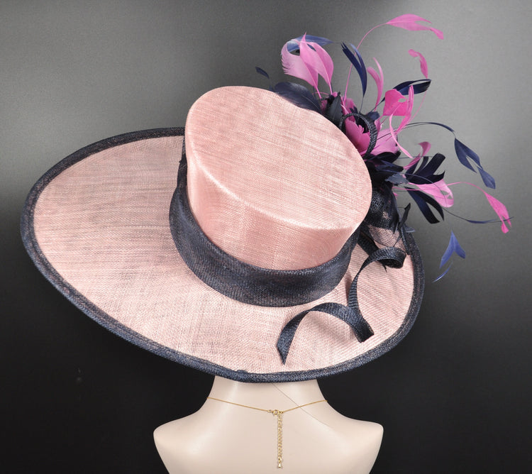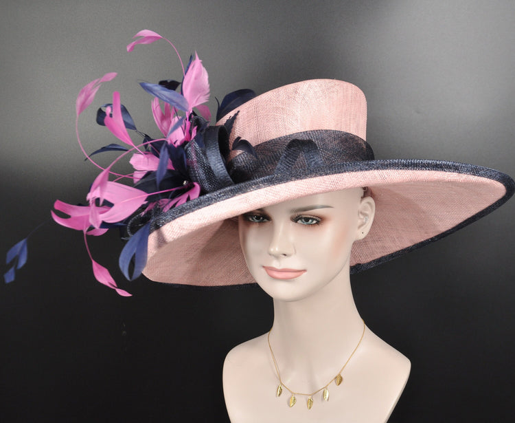 Church Kentucky Derby Hat Carriage Tea Party Wedding Wide Brim Woman’s Royal Ascot Hat in Solid Sinamay Hat Blush Pink Navy blue Hot Pink