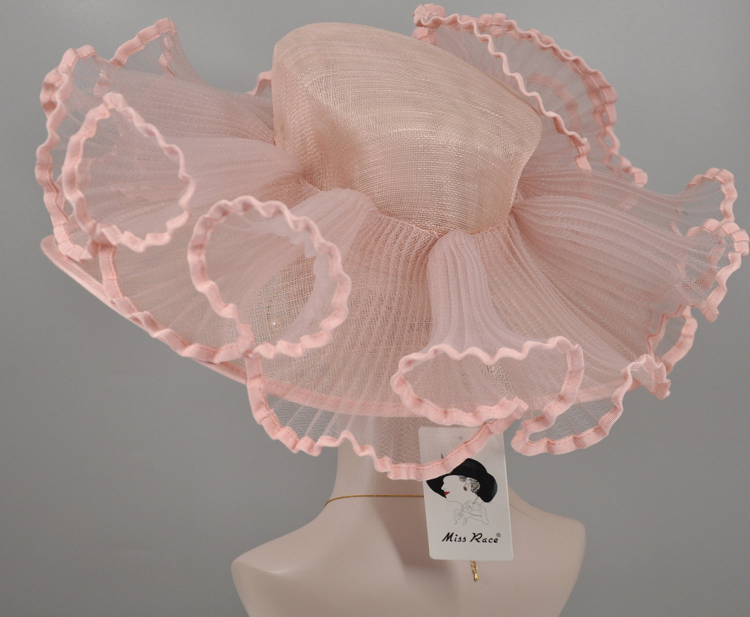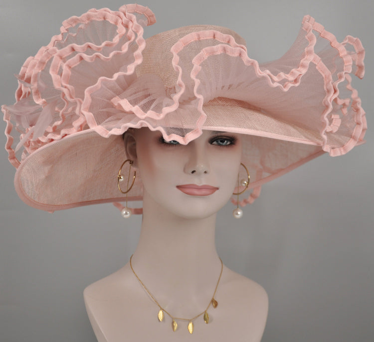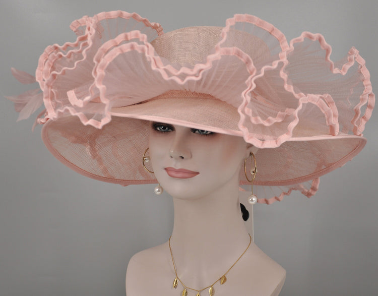 Church Kentucky Derby Hat Carriage Tea Party Wedding Wide Brim Woman's Hat in Sinamay Hat w Wave Style Crin Decorations Blush Pink