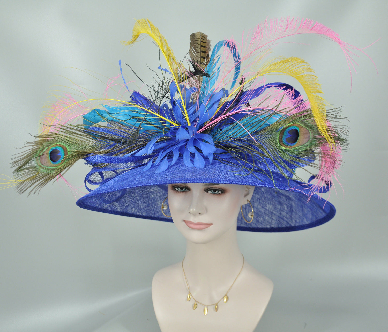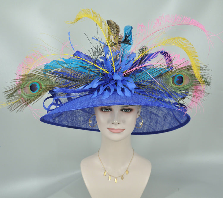 Church Kentucky Derby Hat Carriage Tea Party Wedding Wide Brim Women's Sinamay Hat W Peacock Feather Flower and Sinamay Bows Royal Blue