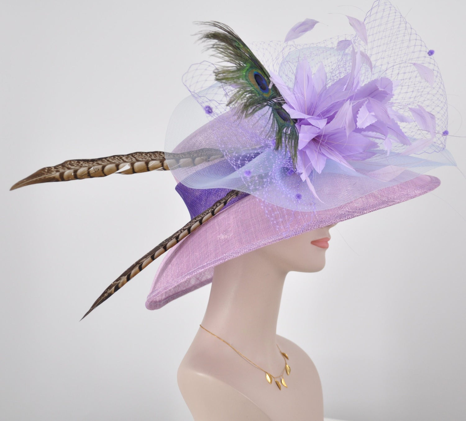 Church Kentucky Derby Hat Wide Brim Sinamay Hat Carriage Tea Party Wedding Lilac Purple Lavender w Peacock and Pheasant Feathers