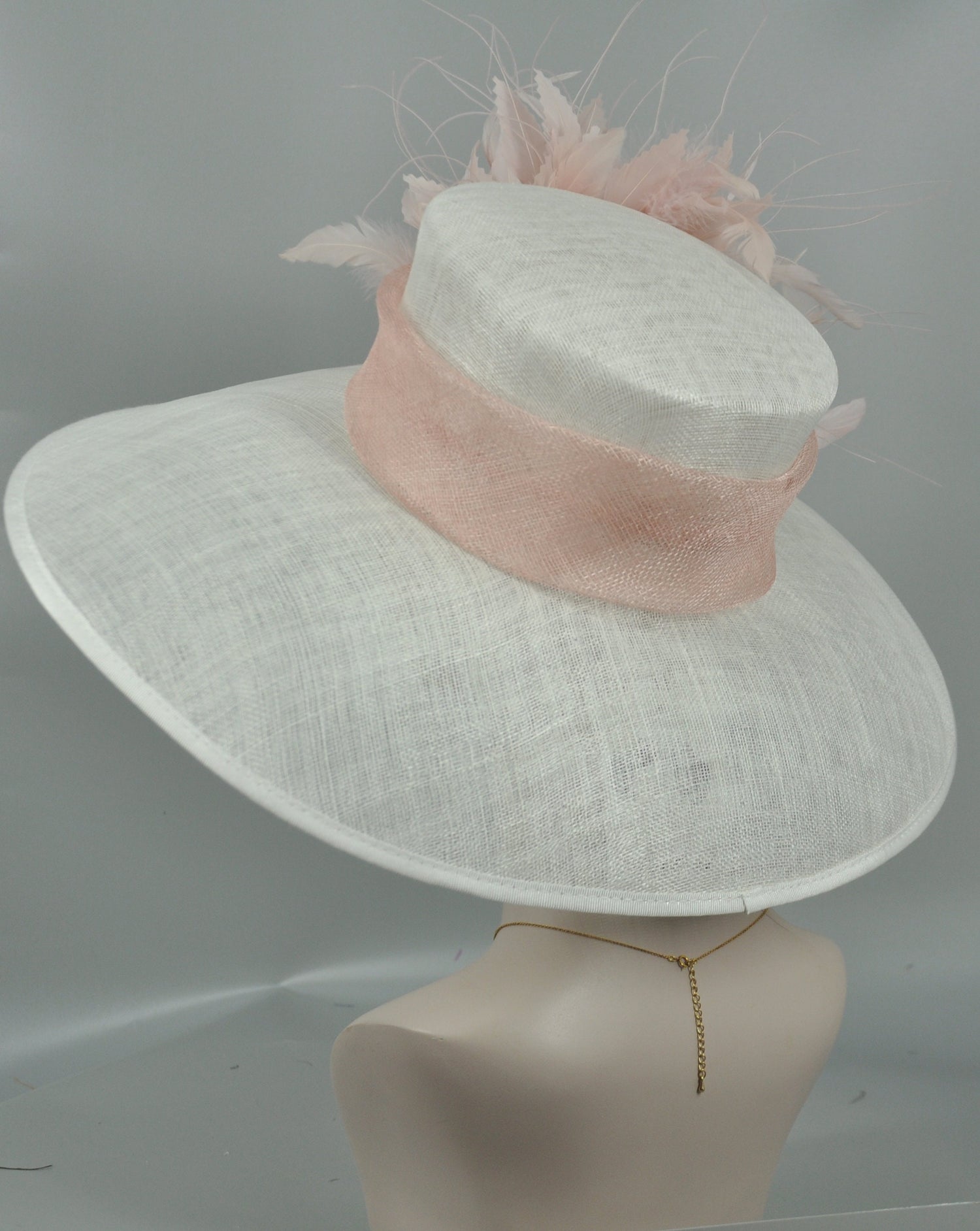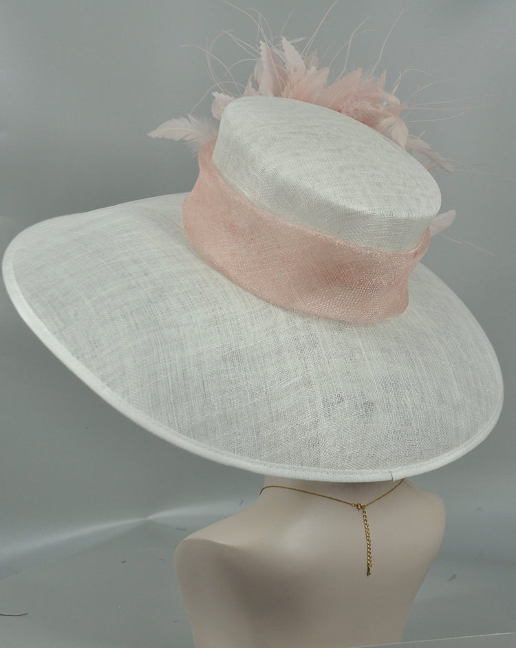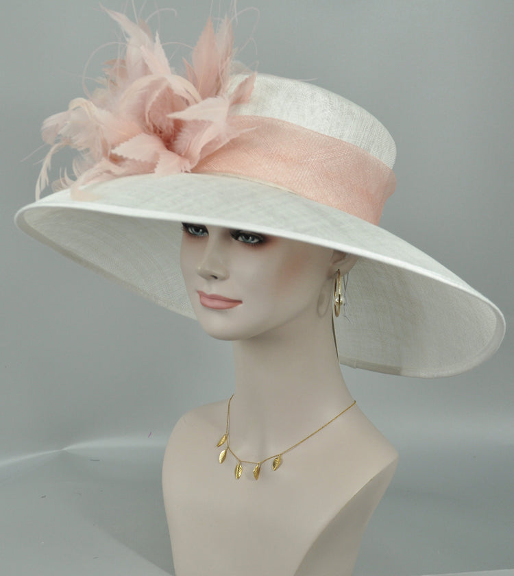 Church Kentucky Derby HatCarriage Tea Party Wedding Wide Brim Royal A Hat Sinamay Hat Off White/Ivory w Dusty/Blush Pink Feather Flower