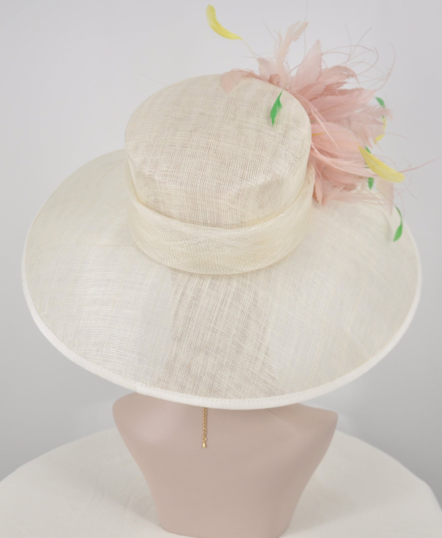 Church Kentucky Derby HatCarriage Tea Party Wedding Wide Brim Royal Hat Sinamay Hat Off White /Ivory w Dusty Pink Feather Flower