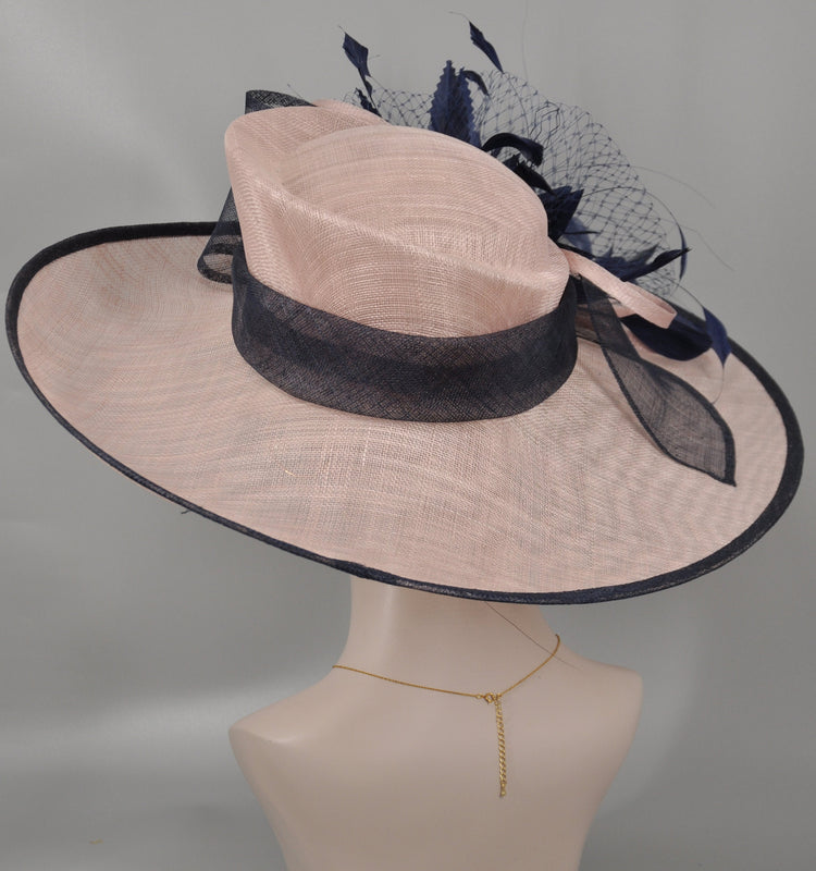 Dusty Pink Sinamay Kentucky Derby Hat: Navy Feather Flower Wide Brim