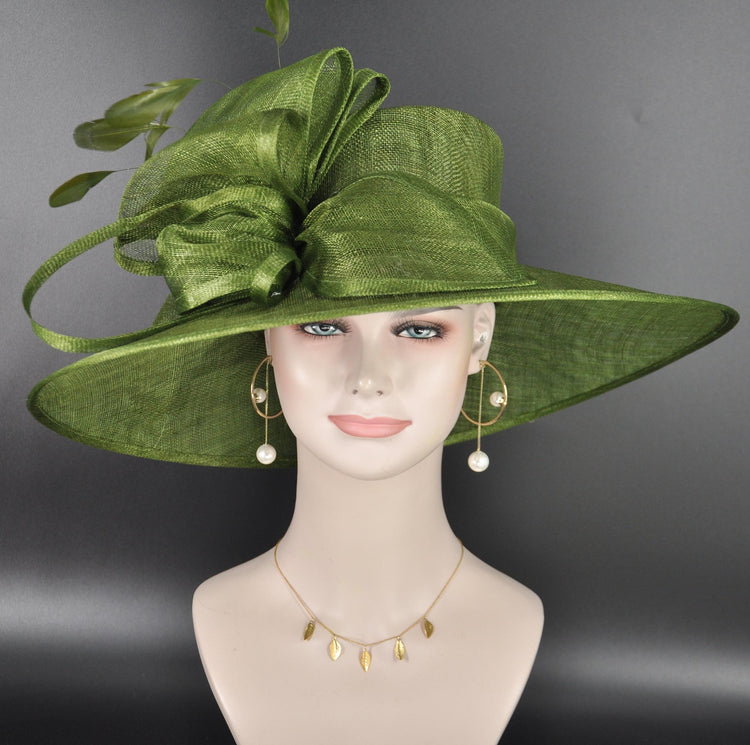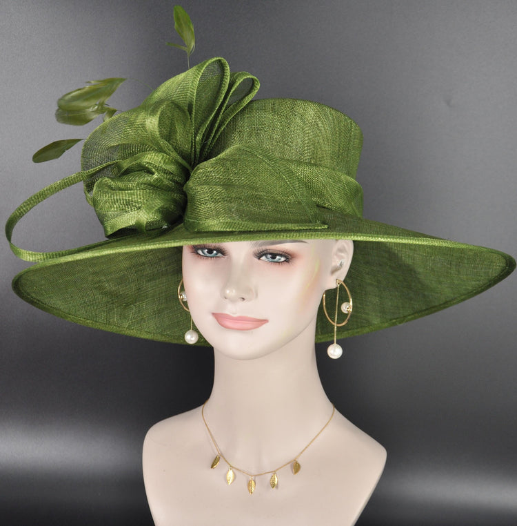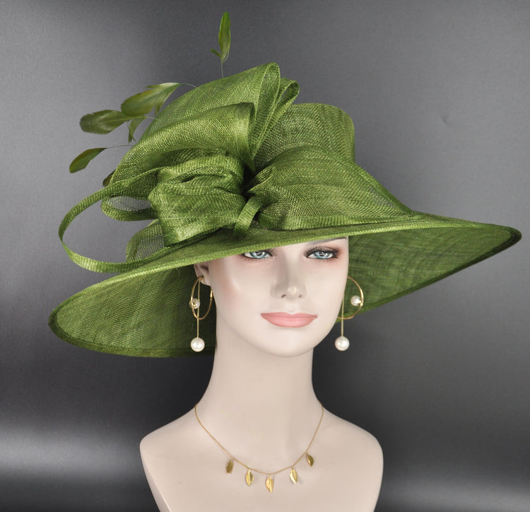 Elegant Olive Green Sinamay Derby Hat, Wide Brim Fascinator for Kentucky Derby, Wedding Guest Hat, Tea Party Hat, Ascot Hat for Women