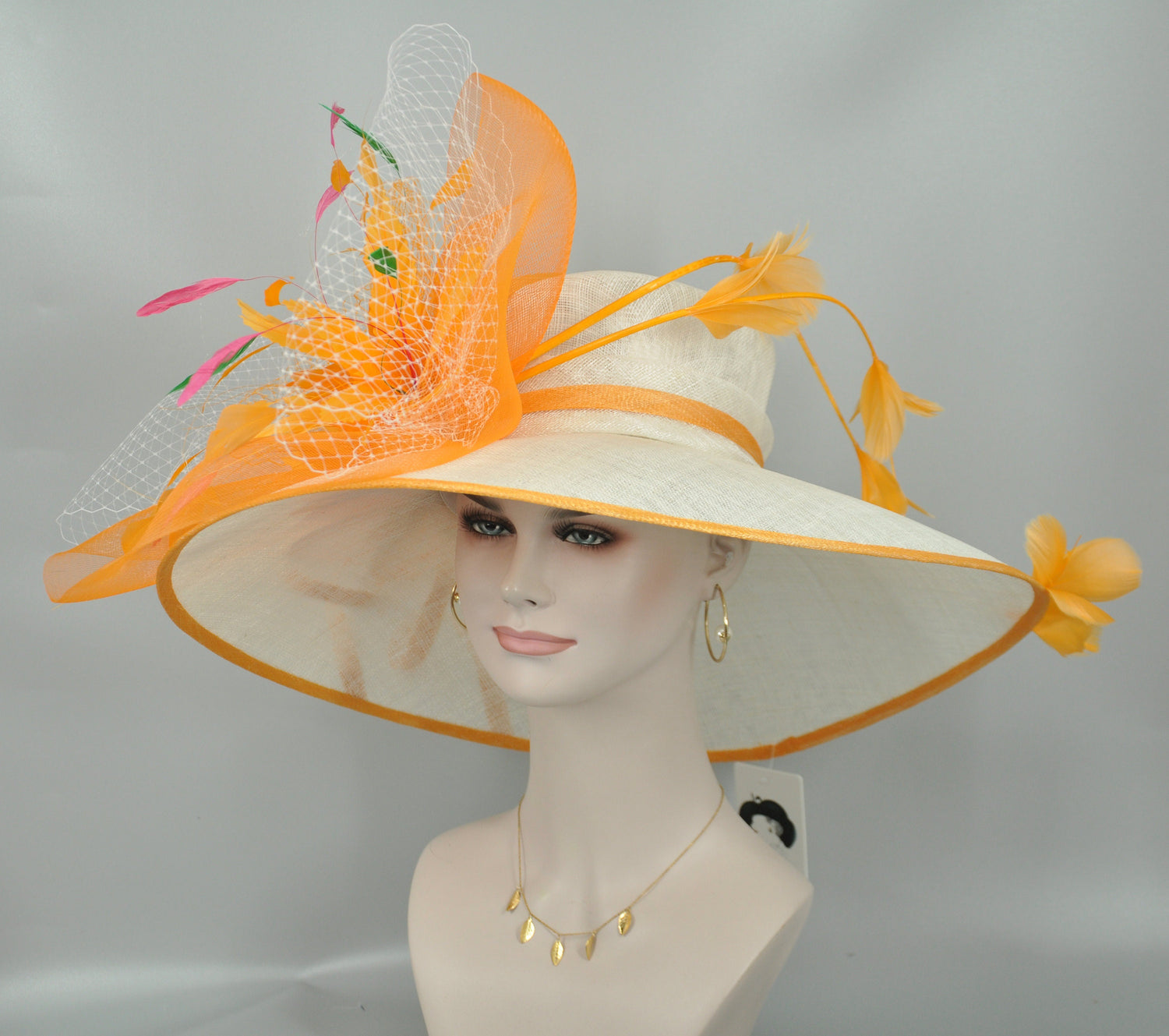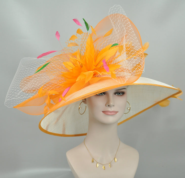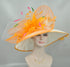 Feather Flower Kentucky Derby Hat: Orange & White Handmade Sinamay