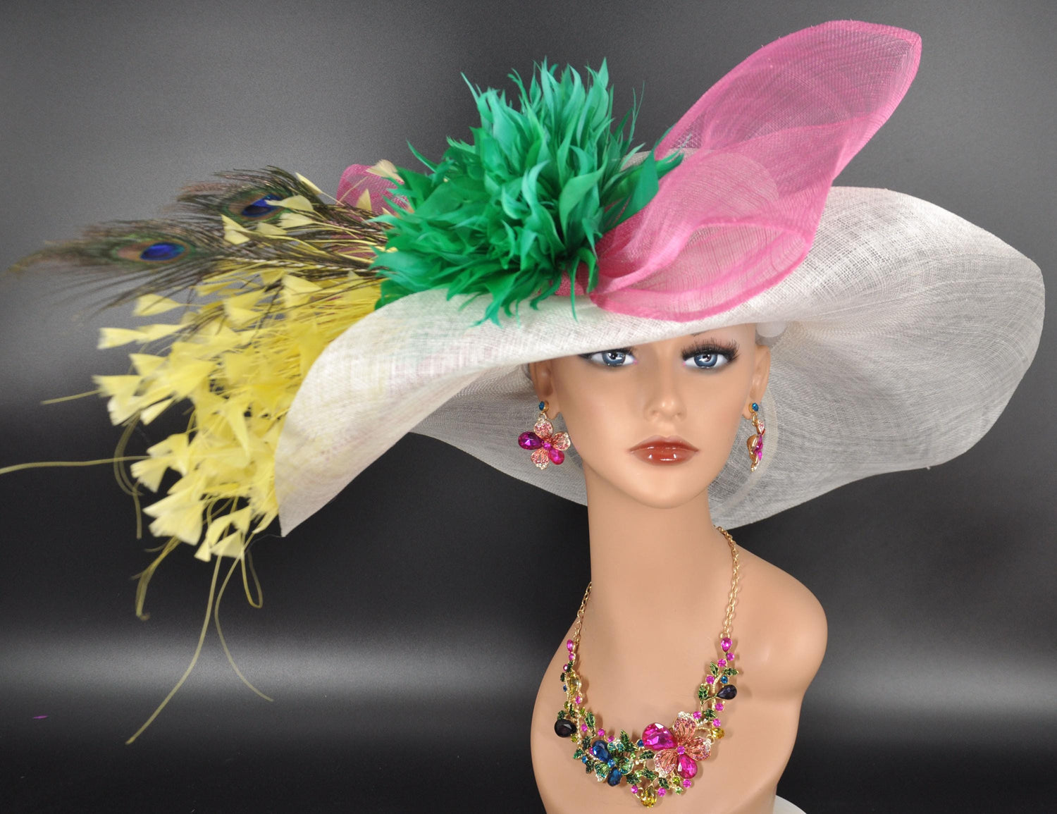 Have questions? Feel free to reach out—we’re happy to help!Fabrication 100% sinamay with Feather Flowers
