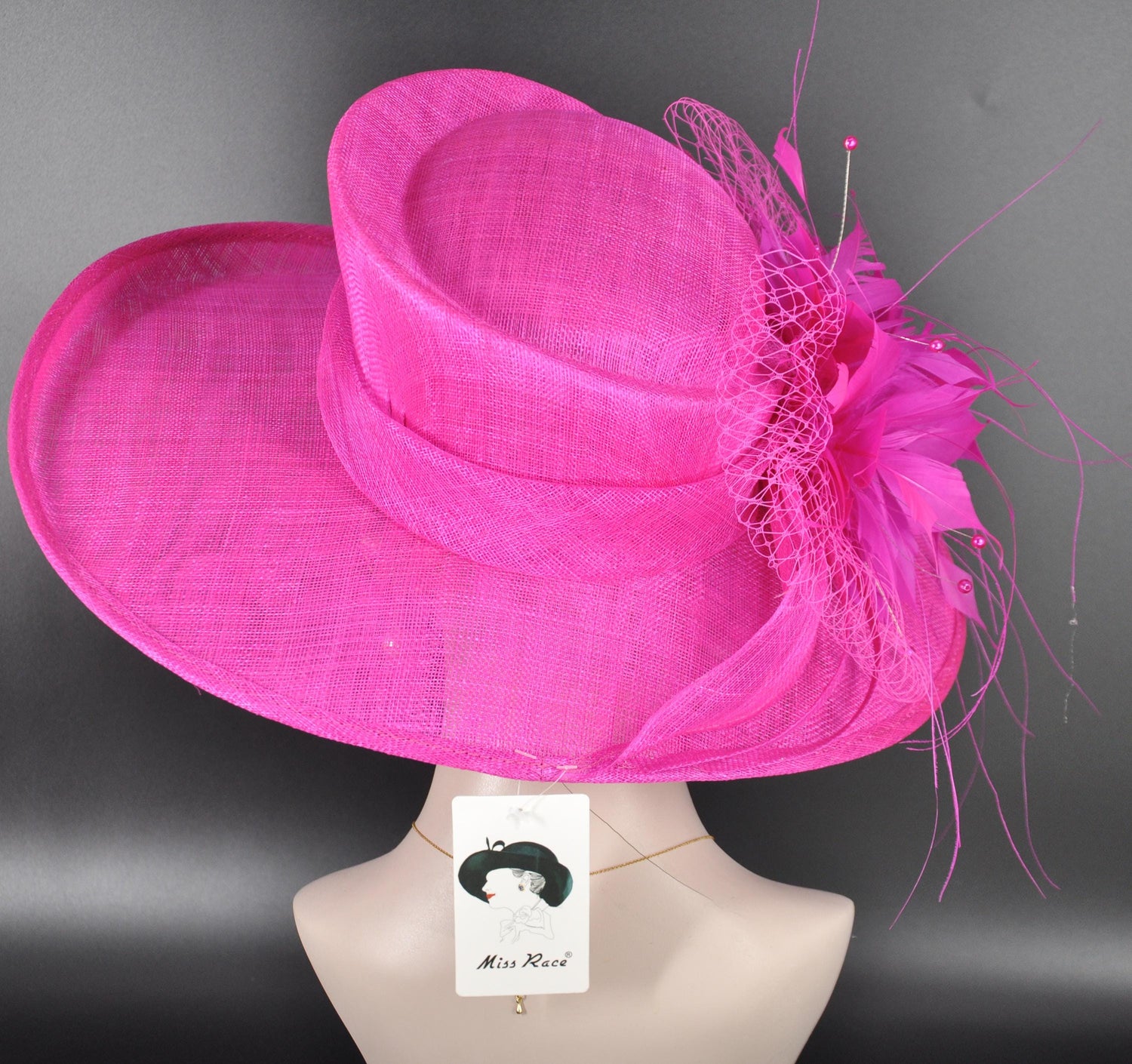 This stunning handcrafted Derby hat is designed to make a statement at any special event. Featuring elegant Fuchsia Pink sinamay, vibrant fuchsia accents, decorative bows, and luxurious feathers, this wide-brim hat adds a sophisticated finishing touch to your race-day or formal outfit. Perfect for the Kentucky Derby, Royal Ascot, garden parties, weddings, or any occasion where you want to stand out with timeless elegance.