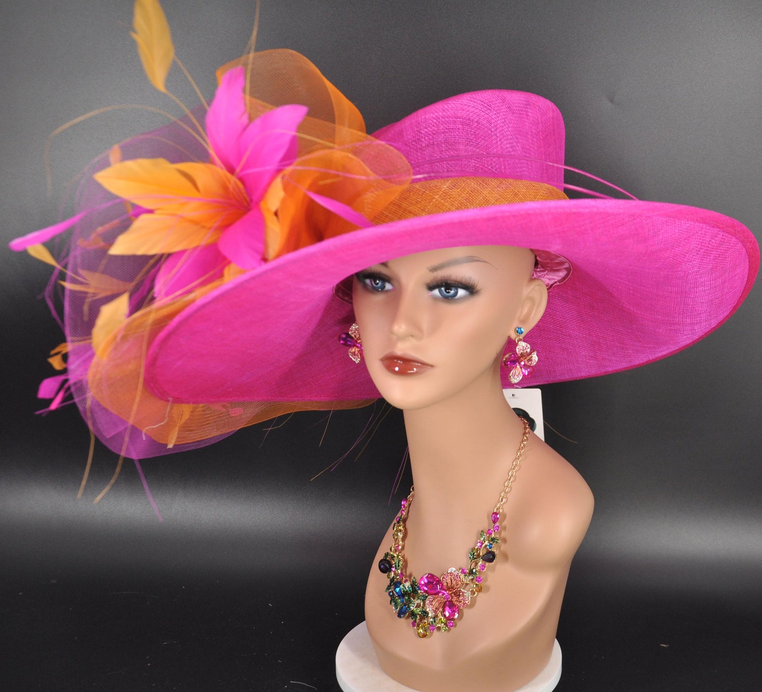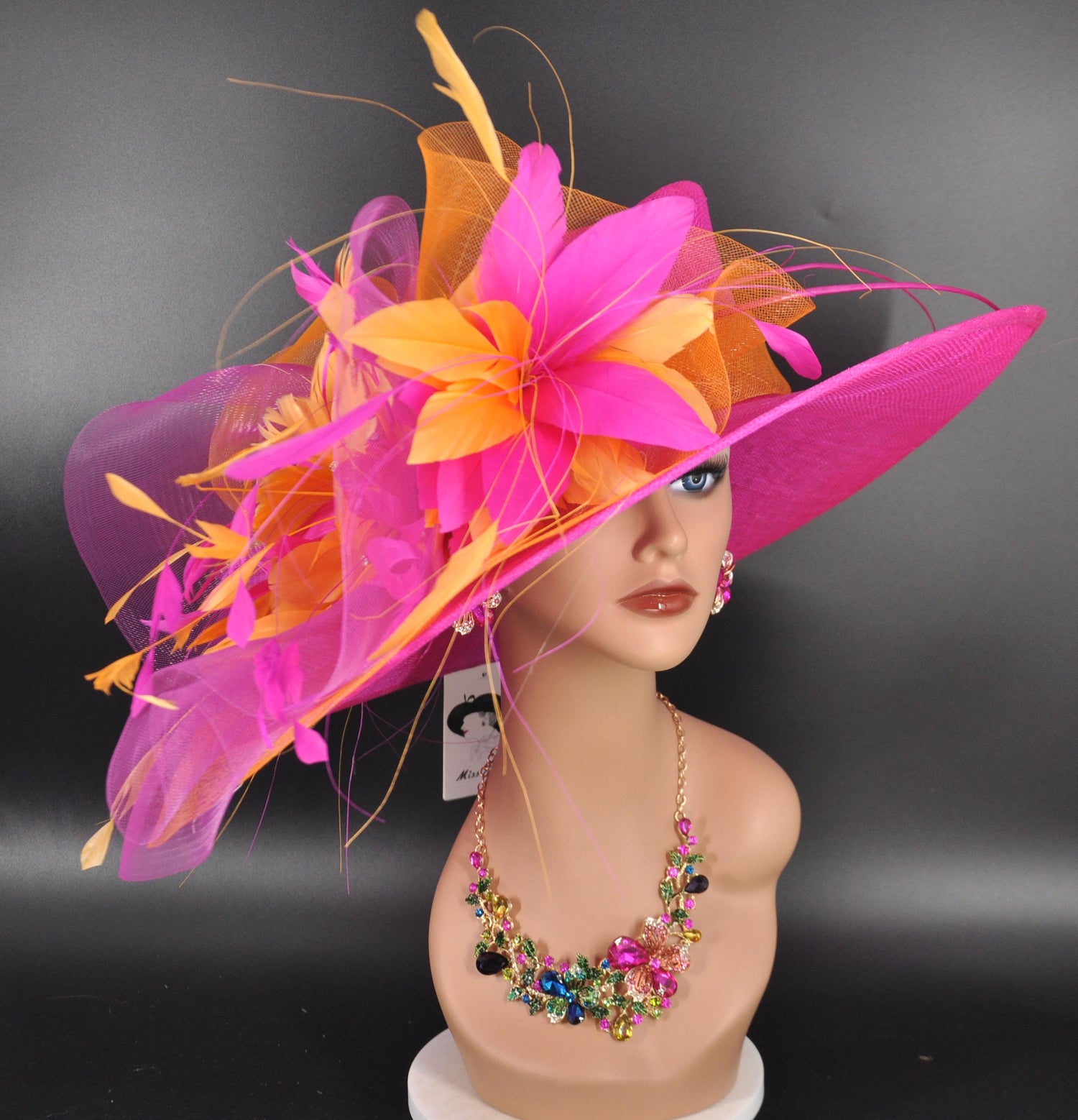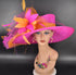 Have questions? Feel free to reach out—we’re happy to help!This stunning Kentucky Derby hat is a true showstopper, crafted from sinamay in a captivating shade of pink. The wide, sweeping brim exudes elegance, while delicate layers of translucent sinamay fabric create a voluminous and airy effect. A dramatic arrangement of hand-curled feathers in various shades of Fuchsia Pink and Orange movement and flair, forming an eye-catching floral-inspired focal point. Subtle crystal embellishments add a touch of sparkle, catching the light with every turn of the head. The hat's intricate design combines vintage sophistication with modern drama, making it the perfect statement piece for the Kentucky Derby, weddings, garden parties, or any formal event where elegance is key.