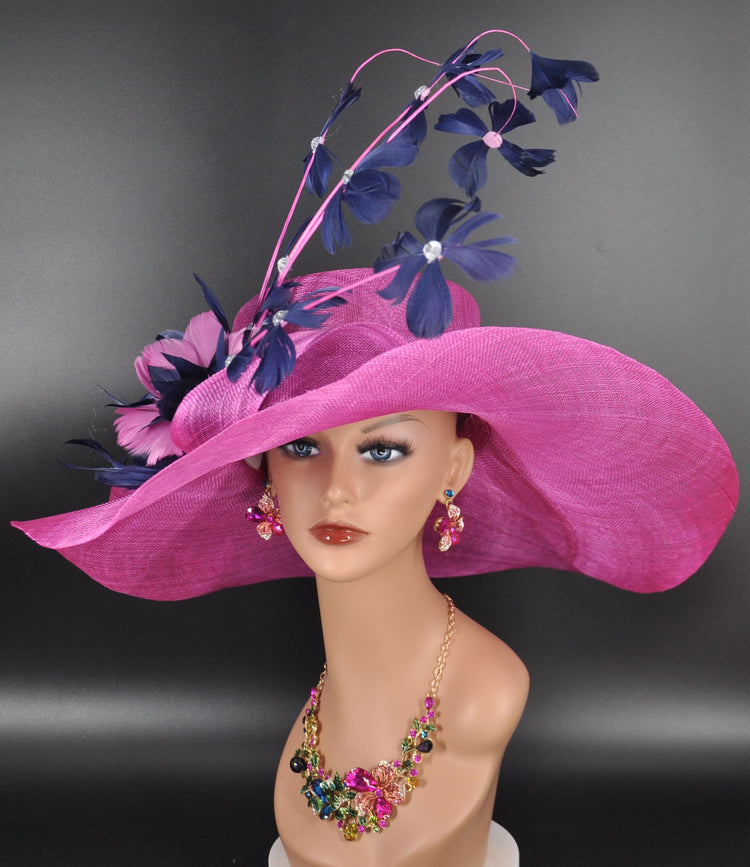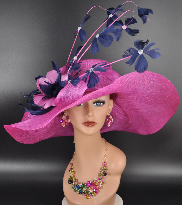 Fuchsia Pink Sinamay Derby Hat: Feather Flower Wide Brim