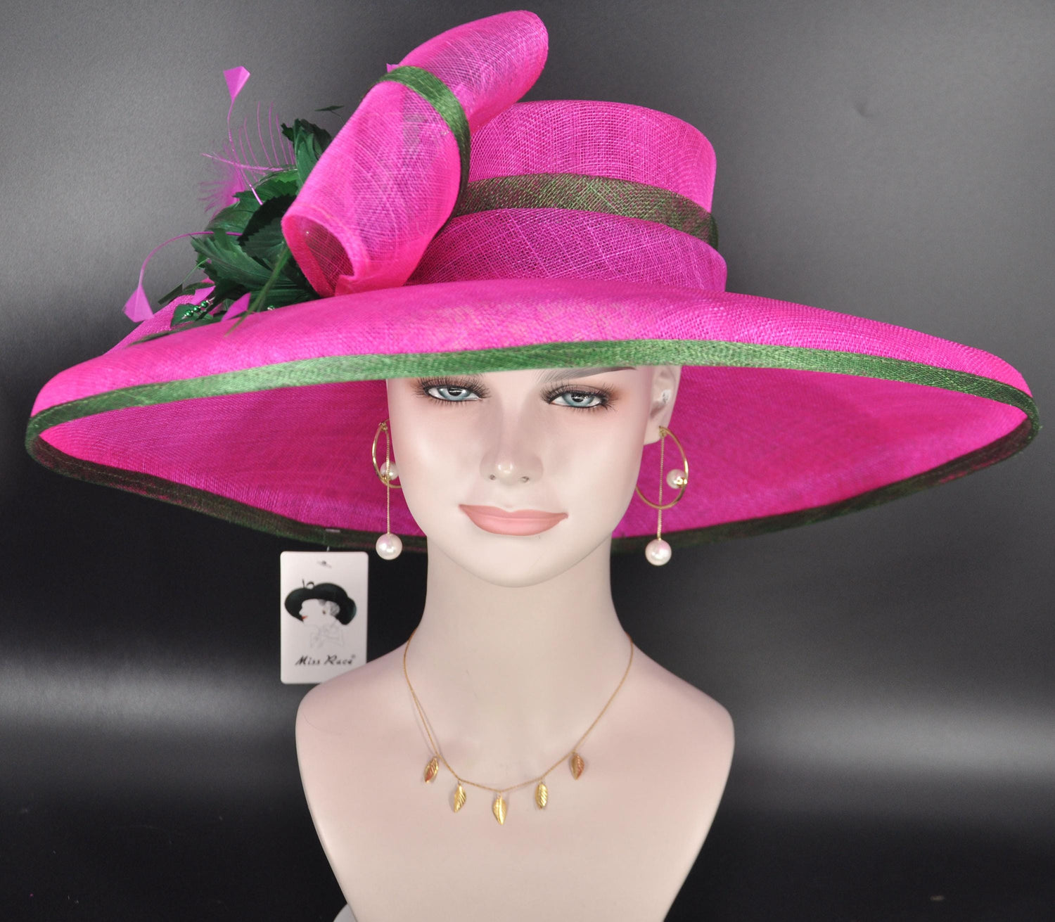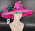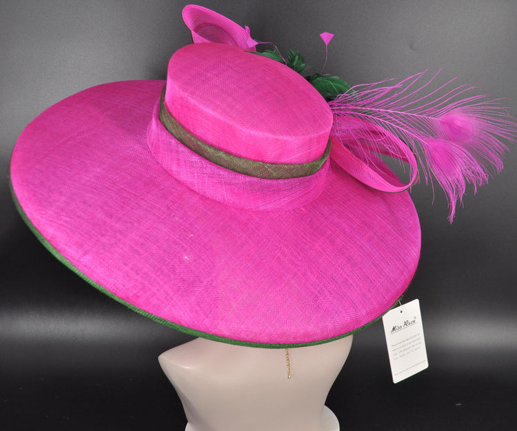 Fuchsia Pink Sinamay Derby Hat: Green Feather Royal Ascot Headpiece
