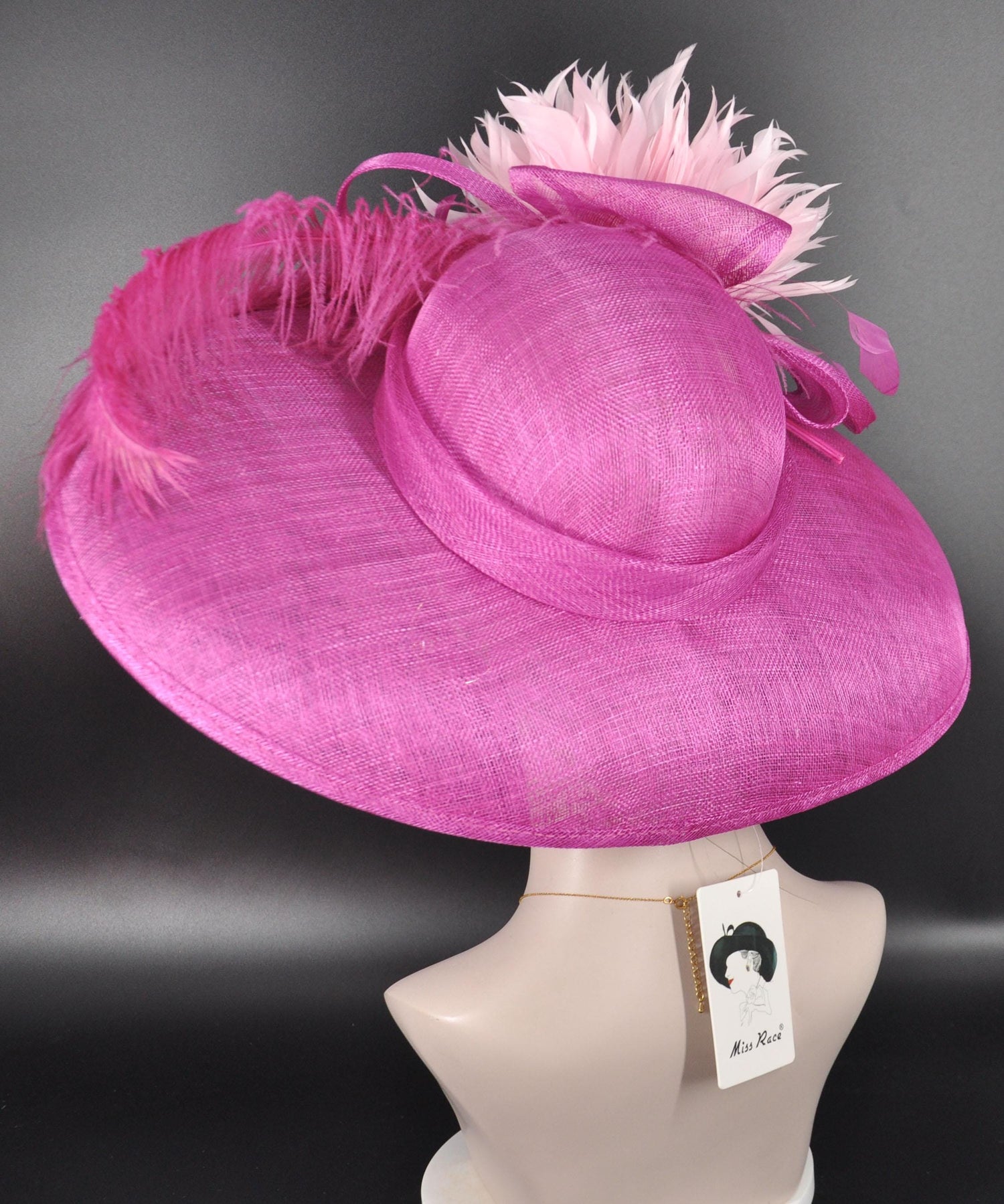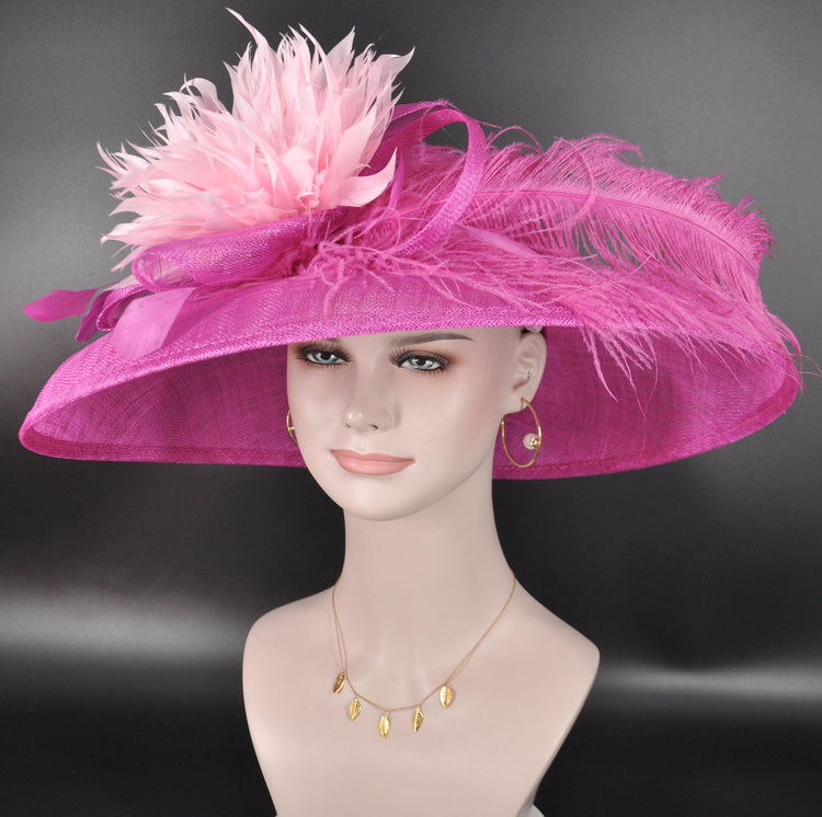 Fuchsia Pink Sinamay Kentucky Derby Hat: Feather Flower Wide Brim