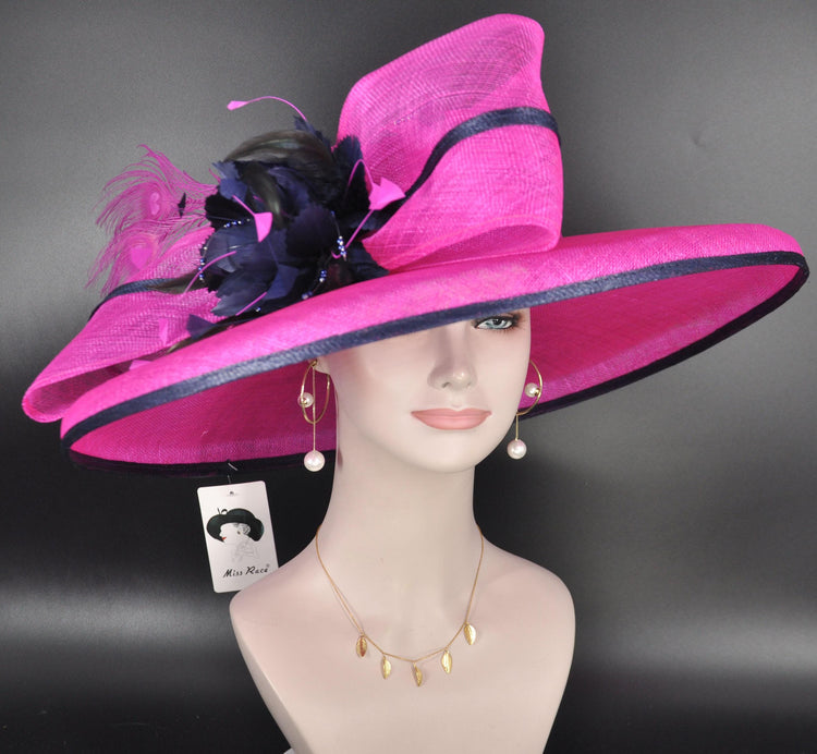 Fuchsia Pink w Navy Blue Feather Hat, Kentucky Derby, Tea Party, Wedding, Church, Royal Ascot Wide Brim Sinamay Hat Oaks Day Hat