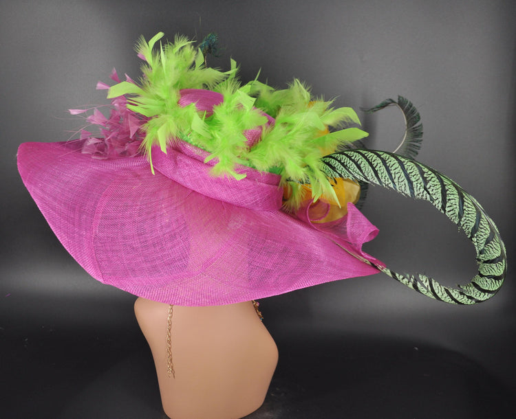 Have questions? Feel free to reach out—we’re happy to help!This soft wide brim sinamay hat is a bold and extravagant design, primarily featuring a fuchsia pink wide-brimmed base. It is adorned with vibrant decorative elements, including a large lemon yellow silk flower, lime green and hot pink feathers, and elegant peacock-like feather accents. The feathers add a dynamic and lively texture, while the colors create a striking contrast. The hat’s side view highlights its dramatic structure and unique blend of colors, making it perfect for events like kentucky derby party, tea party, high fashion shows or formal gatherings.