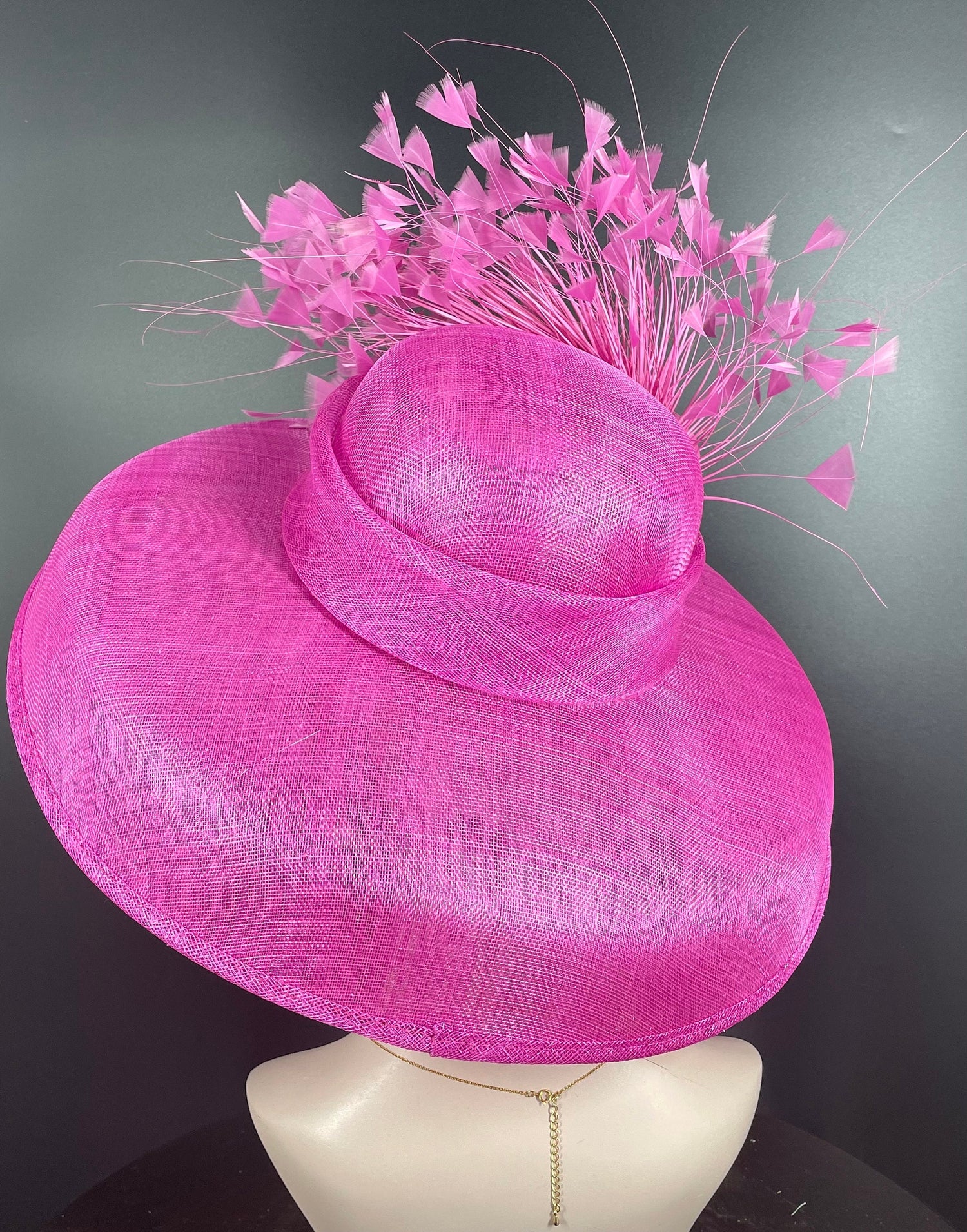 Fuchsia Sinamay Derby Hat: Feather Flower Tea Party Hat