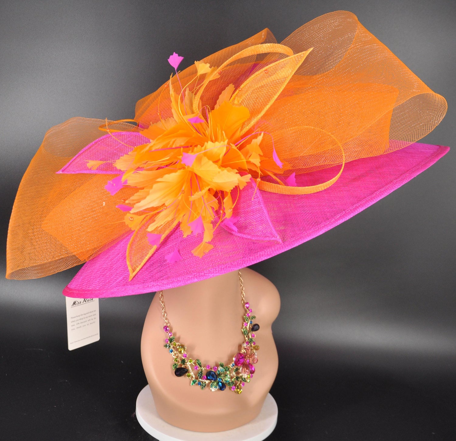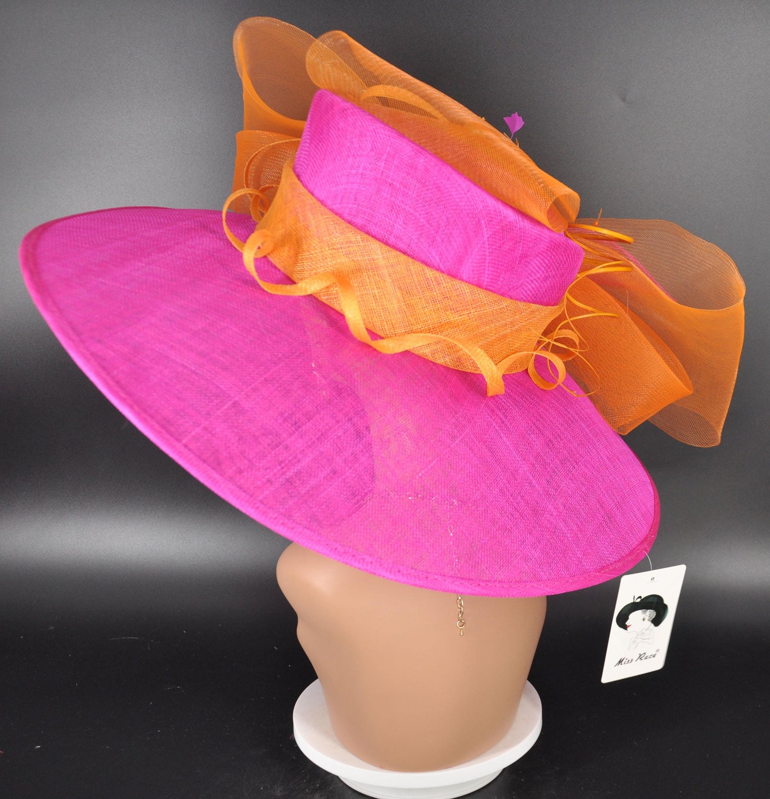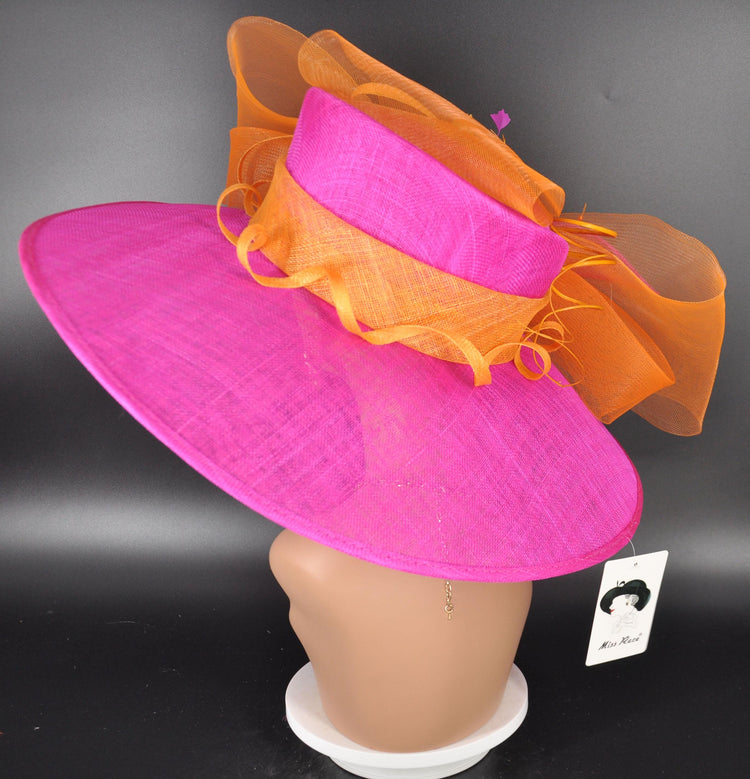 Fuchsia Sinamay Kentucky Derby Hat: Orange Feather Church Wedding Brim