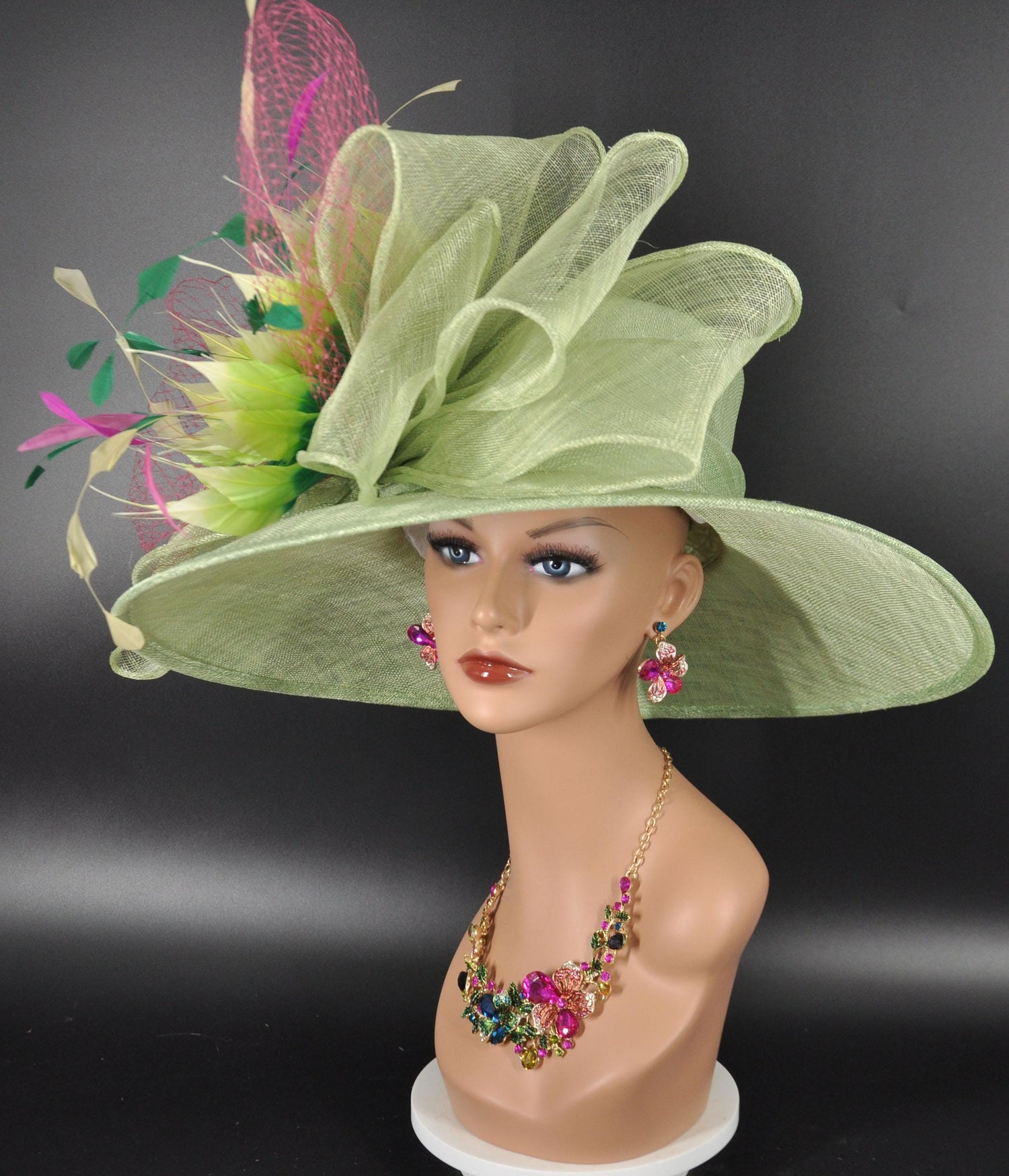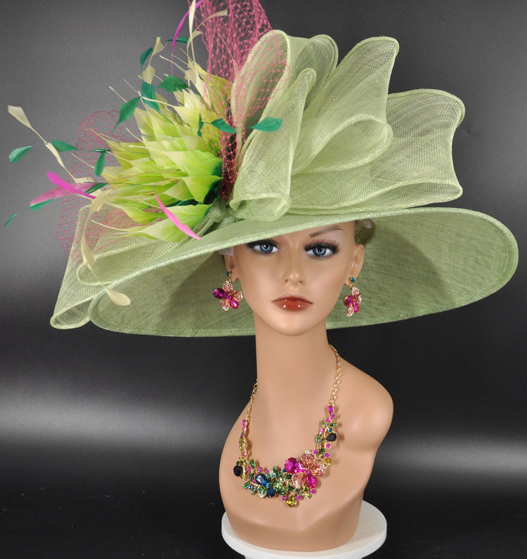 Green Sinamay Kentucky Derby Hat: Jumbo Bows, Flowers, Pink Netting