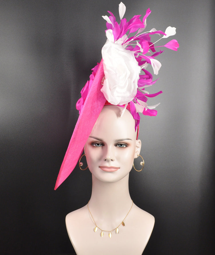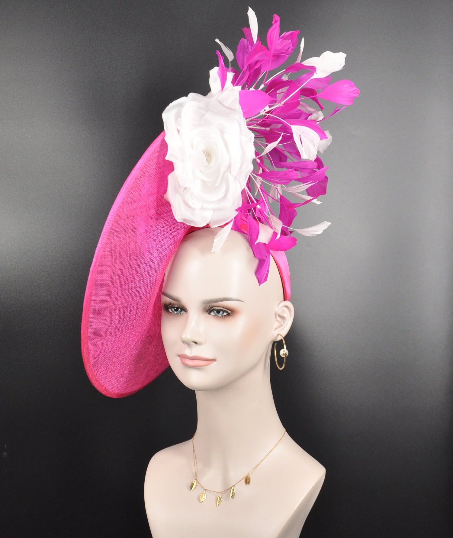 Hot Pink Sinamay Fascinator Hat: Silk & Feather Flowers, Derby Tea Party Headwear