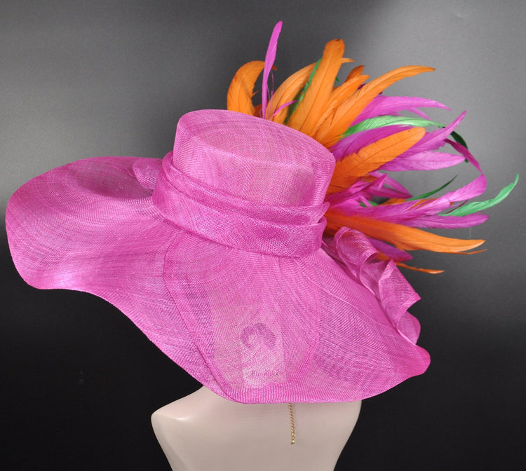 Hot Pink Sinamay Kentucky Derby Hat: Feather Tea Party Wide Brim