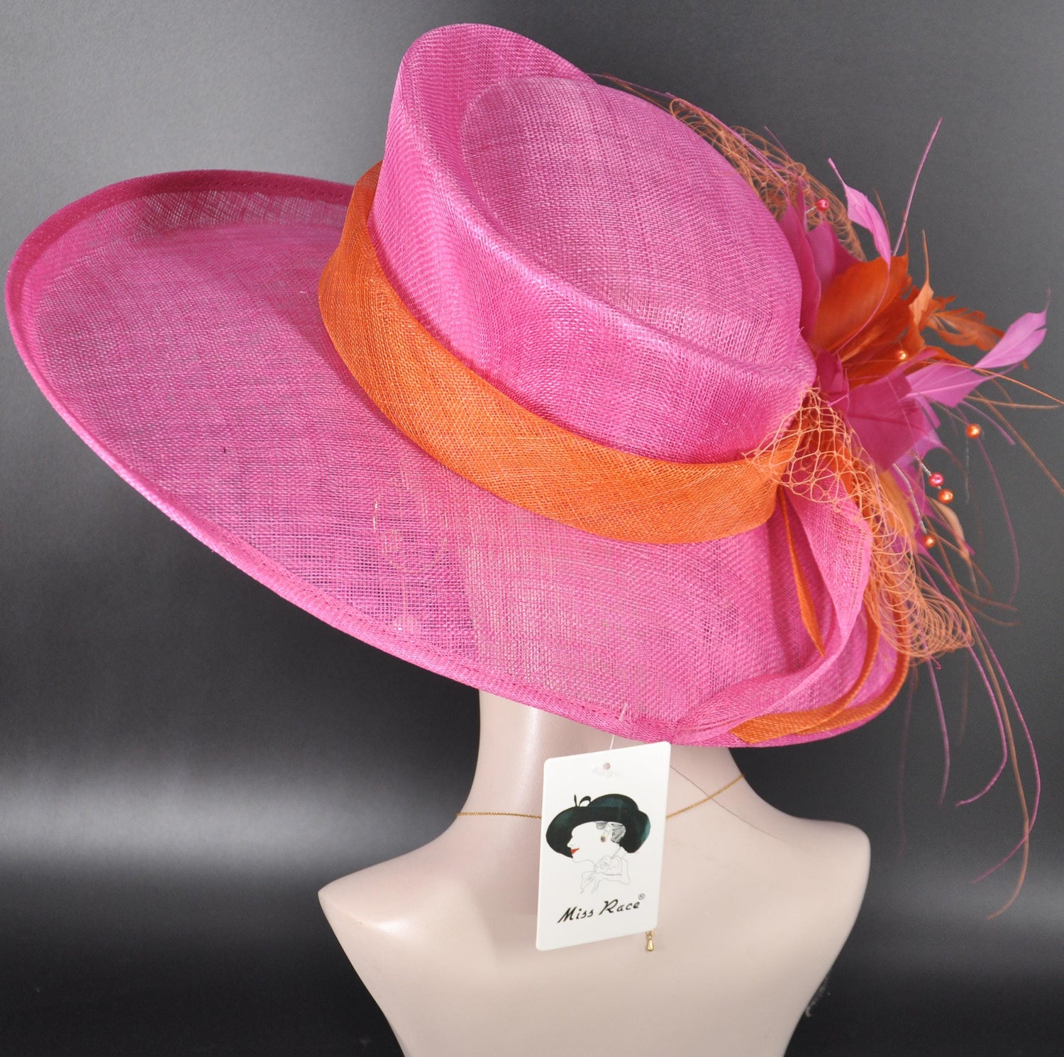 Hot Pink w Orange Derby Hat, Wide Brim Sinamay Hat Royal Ascot Hat, Tea Party Hat, Wedding Guest Hat, Spring Racing Hat