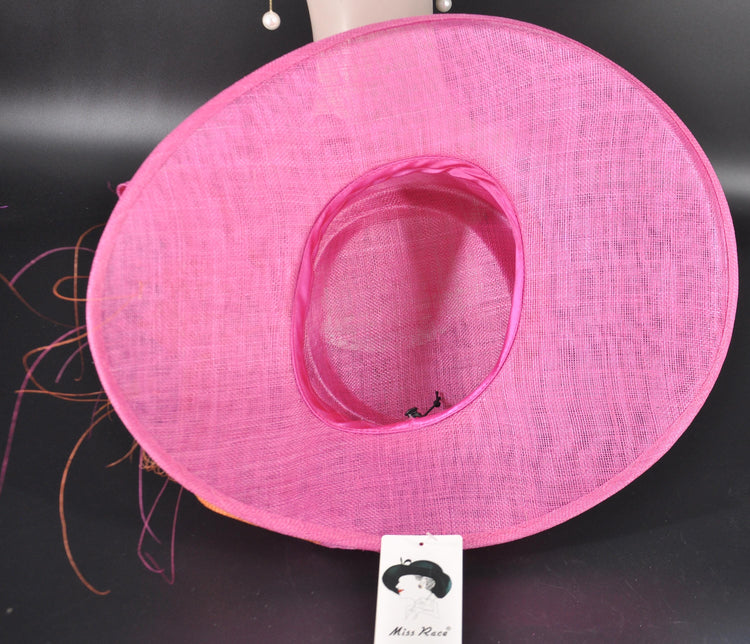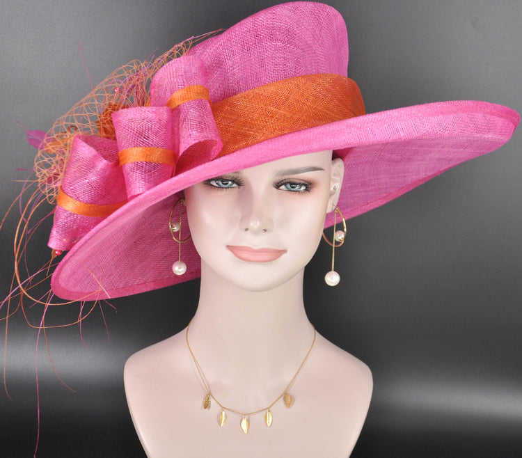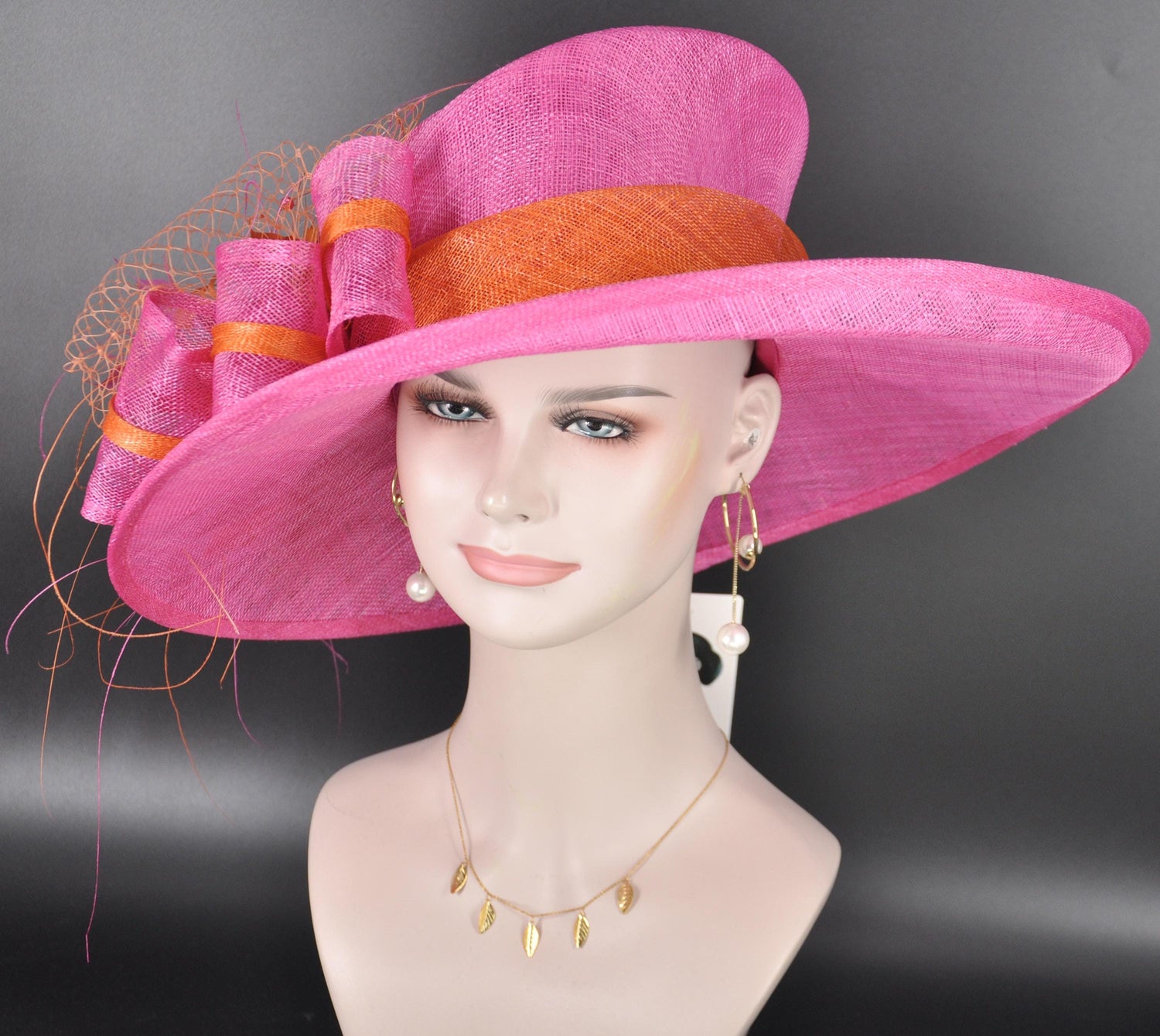 This stunning handcrafted Derby hat is designed to make a statement at any special event. Featuring elegant Hot Pink w Orange sinamay, vibrant Hot Pink w Orange accents, decorative bows, and luxurious feathers, this wide-brim hat adds a sophisticated finishing touch to your race-day or formal outfit. Perfect for the Kentucky Derby, Royal Ascot, garden parties, weddings, or any occasion where you want to stand out with timeless elegance.