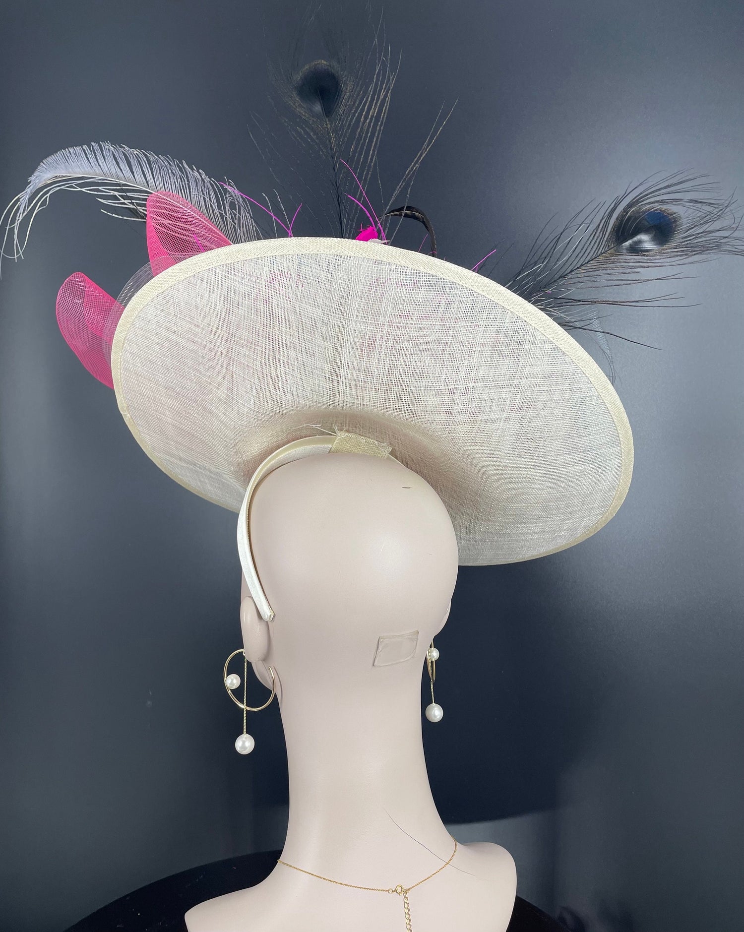 This gorgeous sinamay fascinator hat, made of Sinamay, forming a disc shape, seated on a same color satin headband, Embellished with a large hand made Feather Flowers