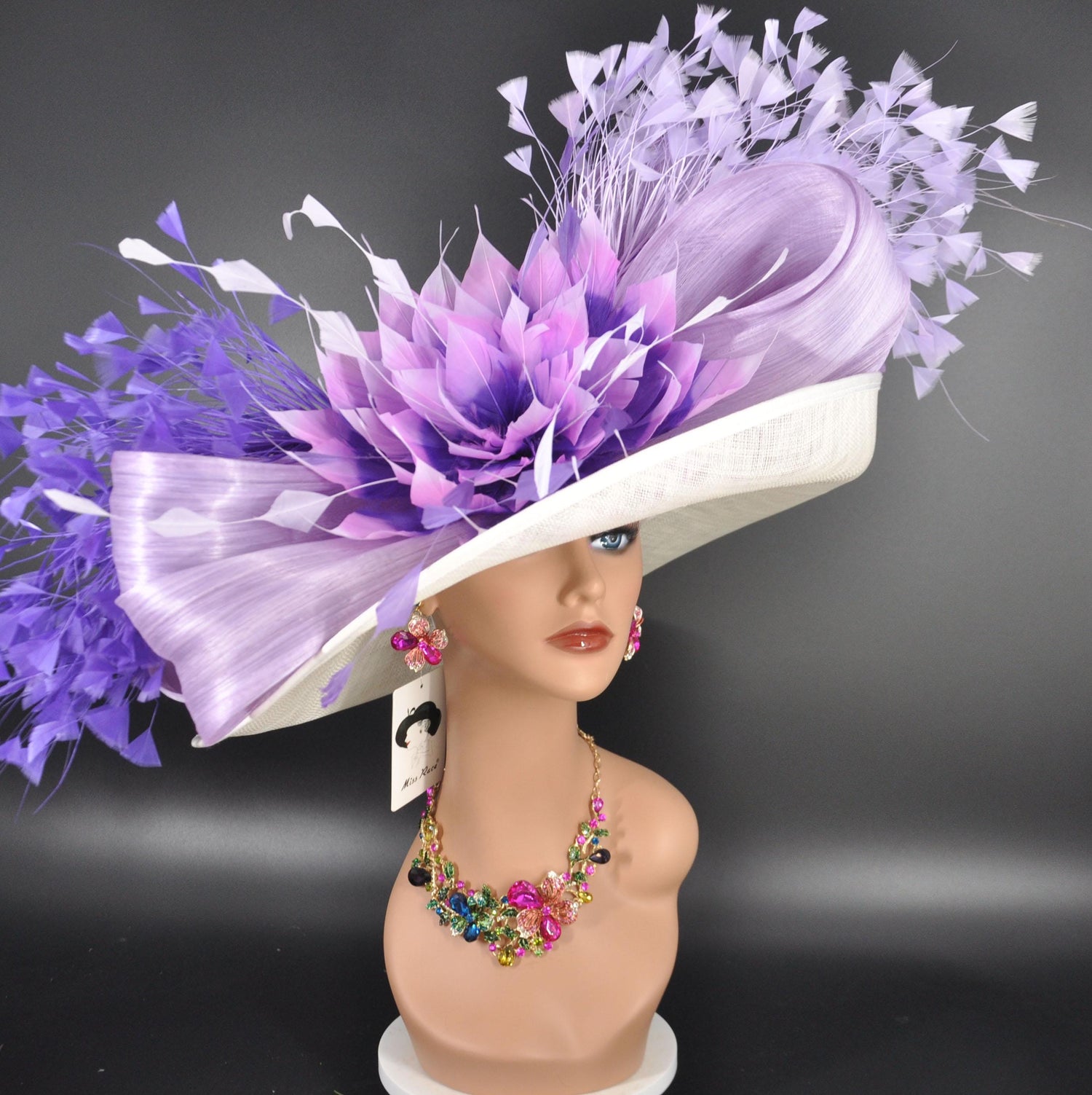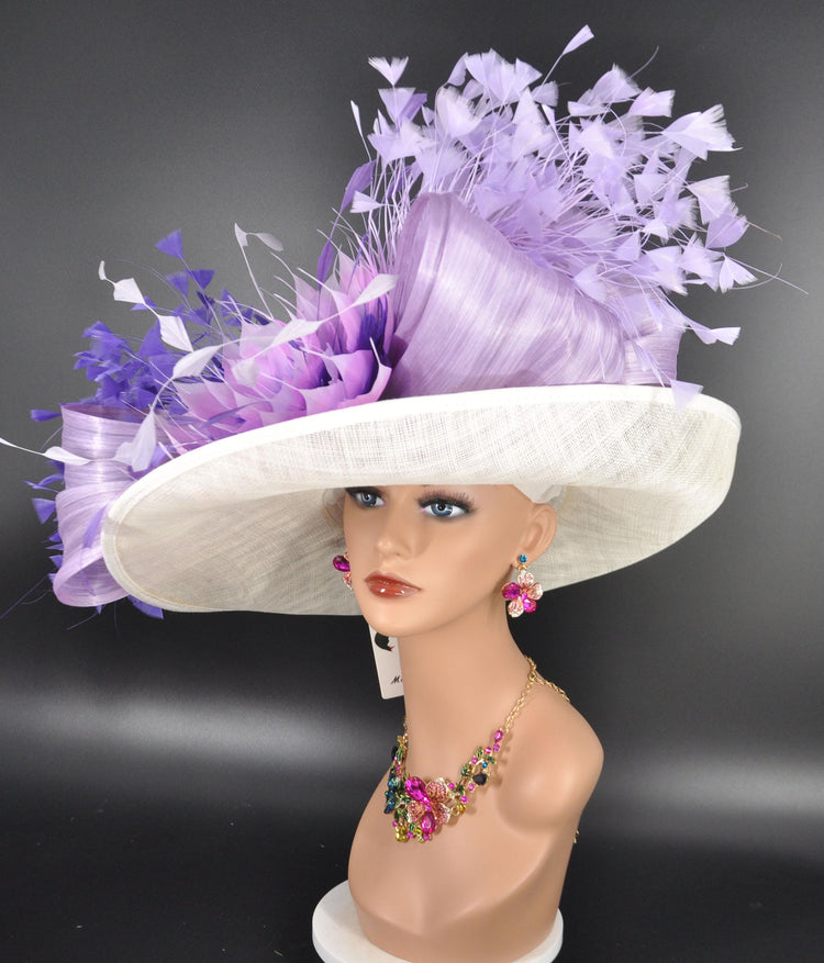 Ivory Sinamay Kentucky Derby Hat: Purple Lavender Feather Wedding Hat