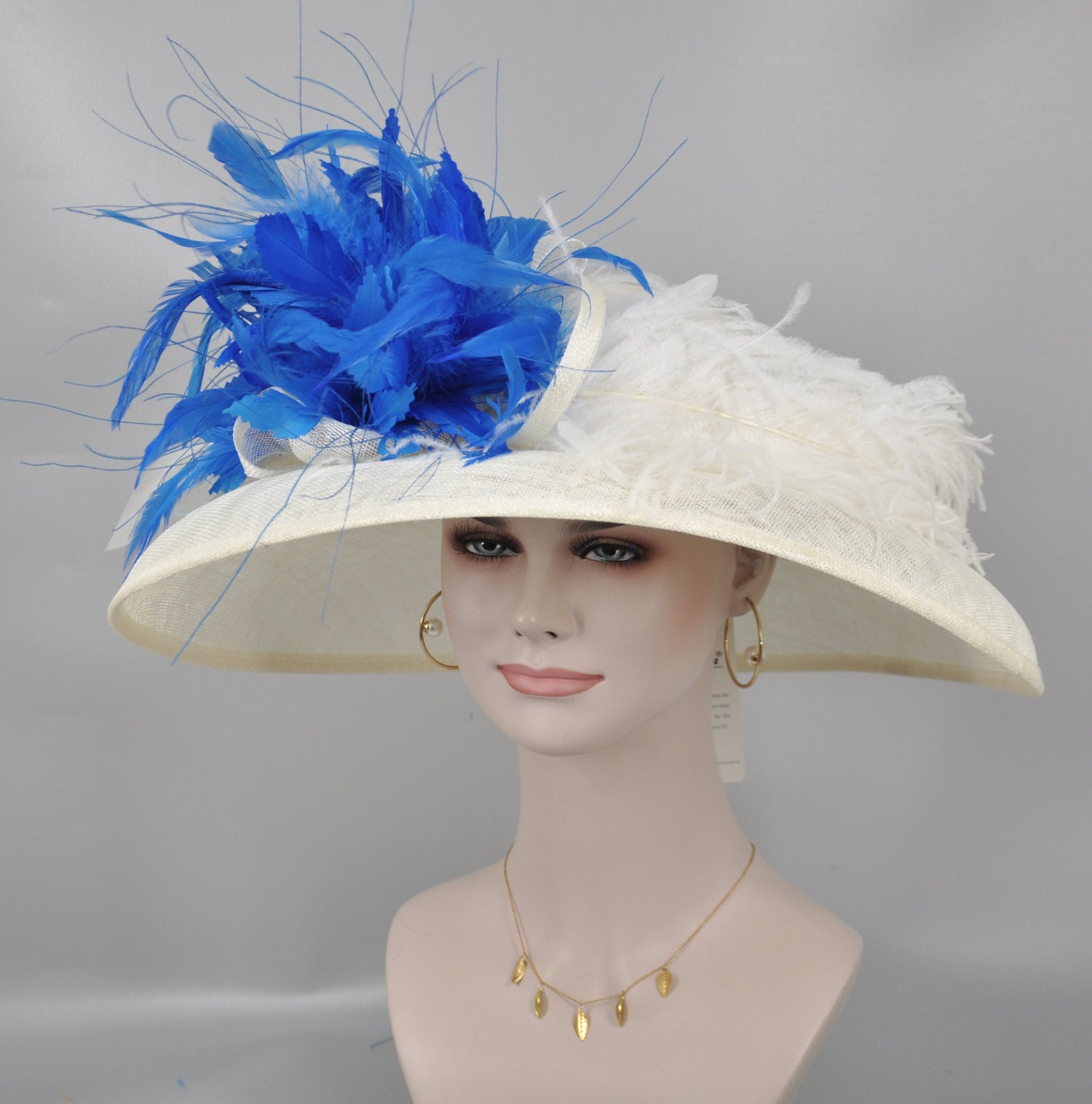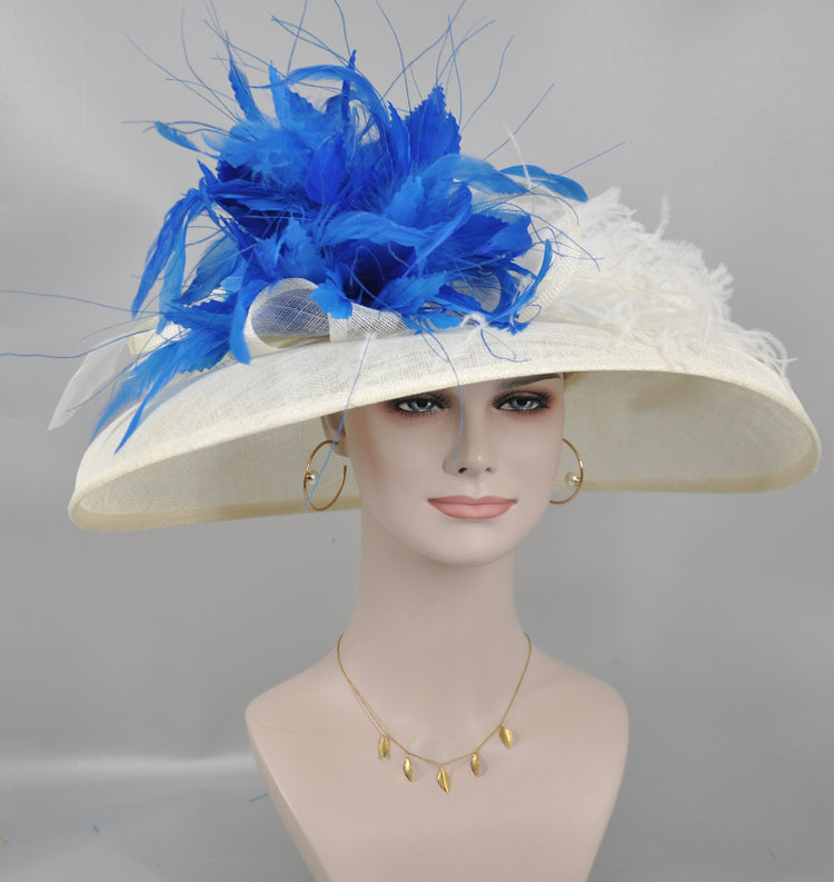 Ivory Sinamay Kentucky Derby Hat: Royal Blue Feather Flower, Wide Brim