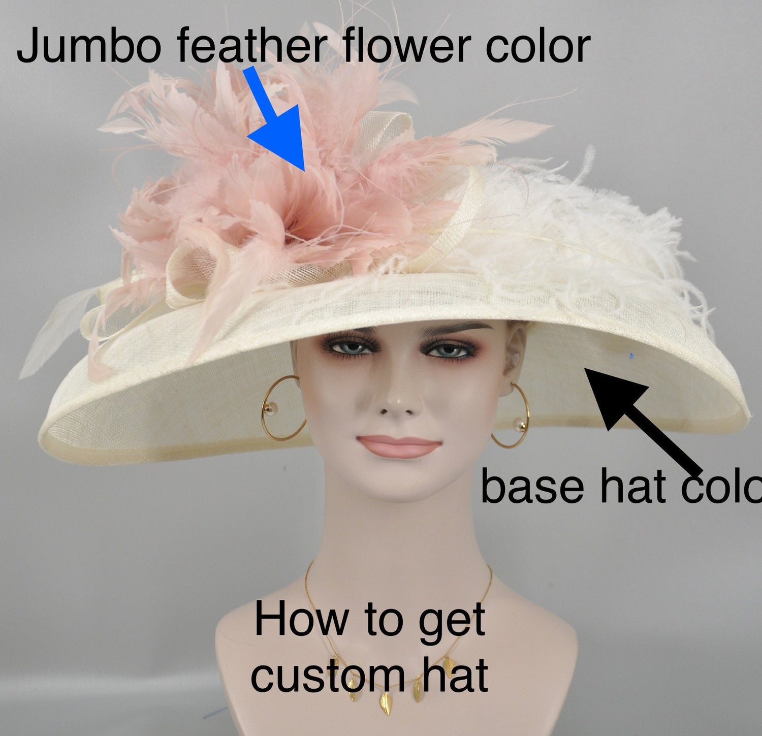 . if you want to change the flowers color to match your dress, check the last picture, tell me the base hat color, the jumbo feather flower color etc.