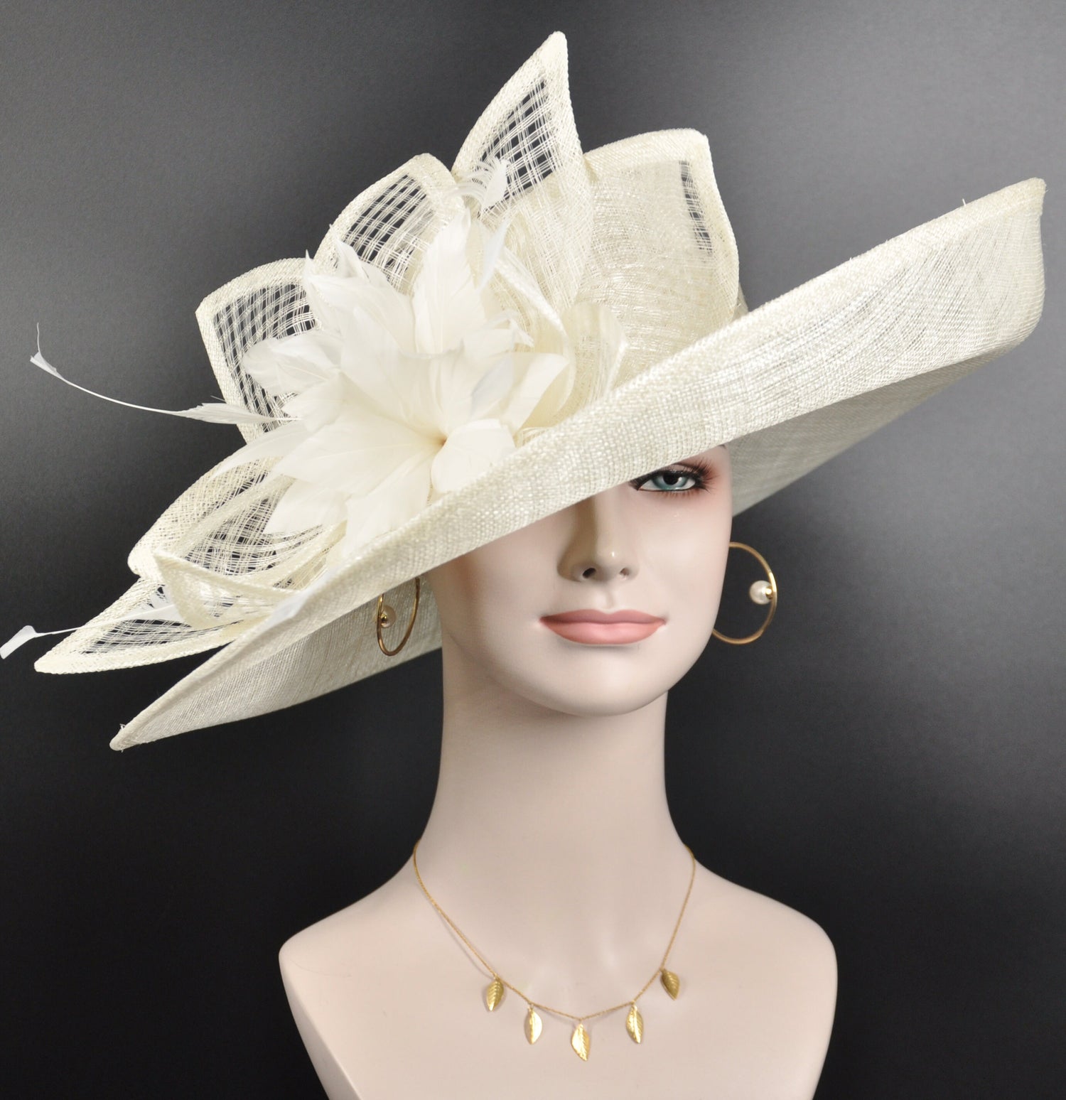 Ivory Sinamay Kentucky Derby Hat: Wide Brim Feathered Ascot Hat