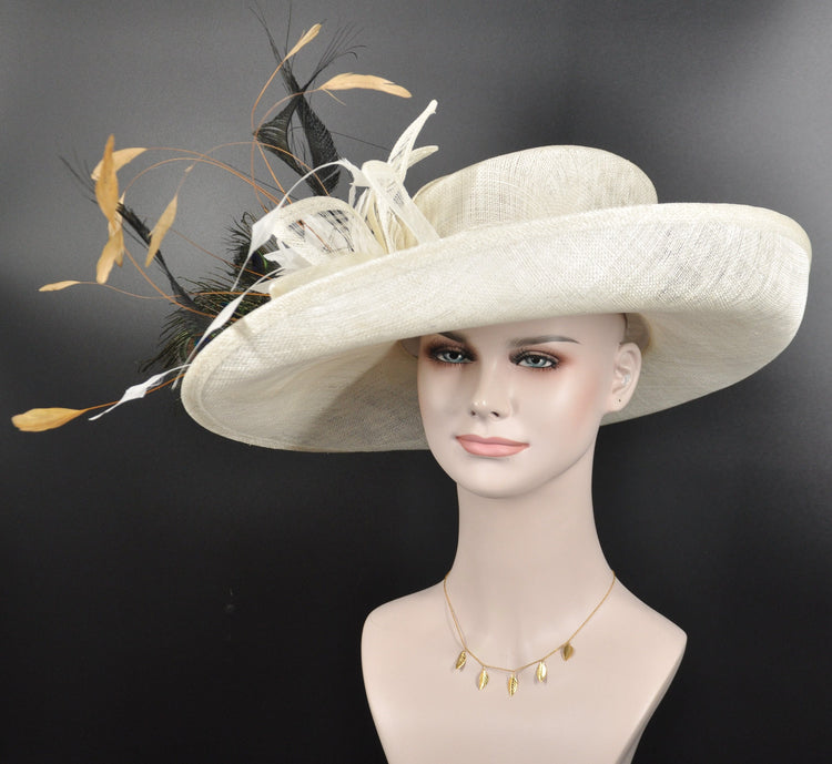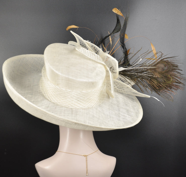 Ivory Sinamay Kentucky Derby Hat: Wide Brim with Gold & Peacock Feathers