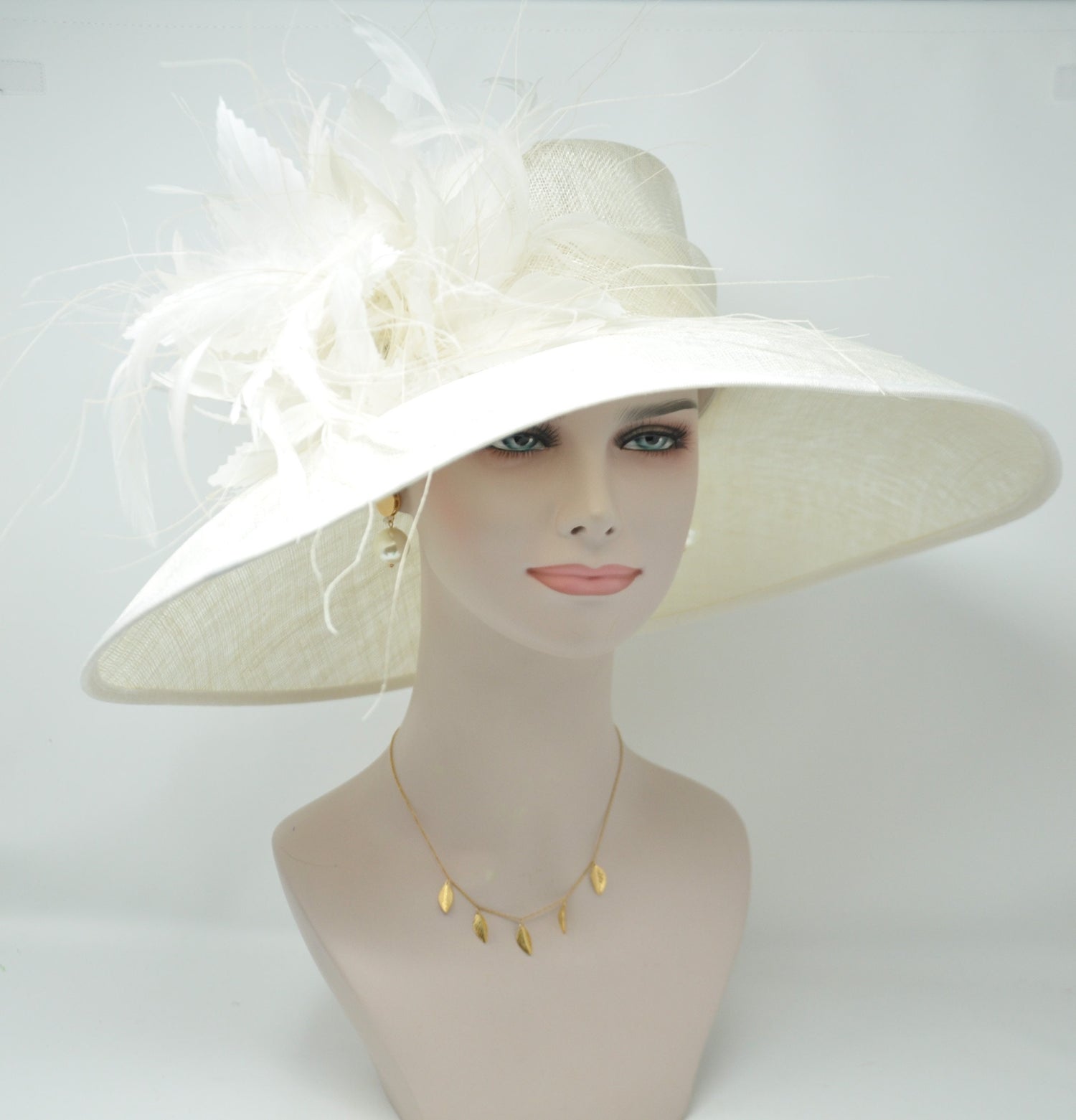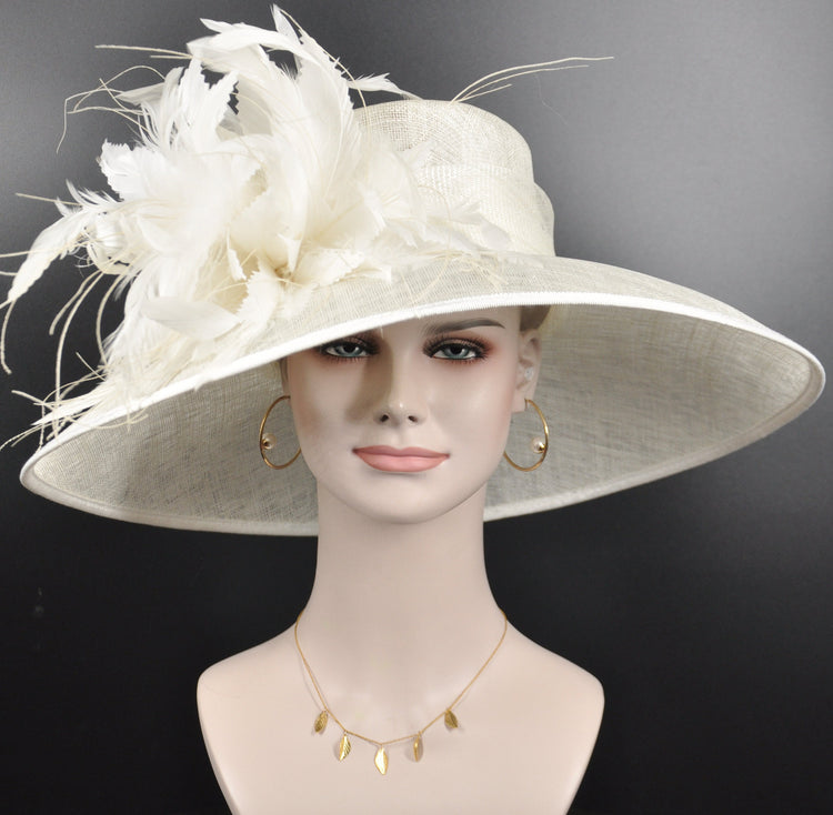 Ivory with Feather Flowers Kentucky Derby Hat Tea Party Carriage Party Royal AscotWide Brim Sinamay Hat