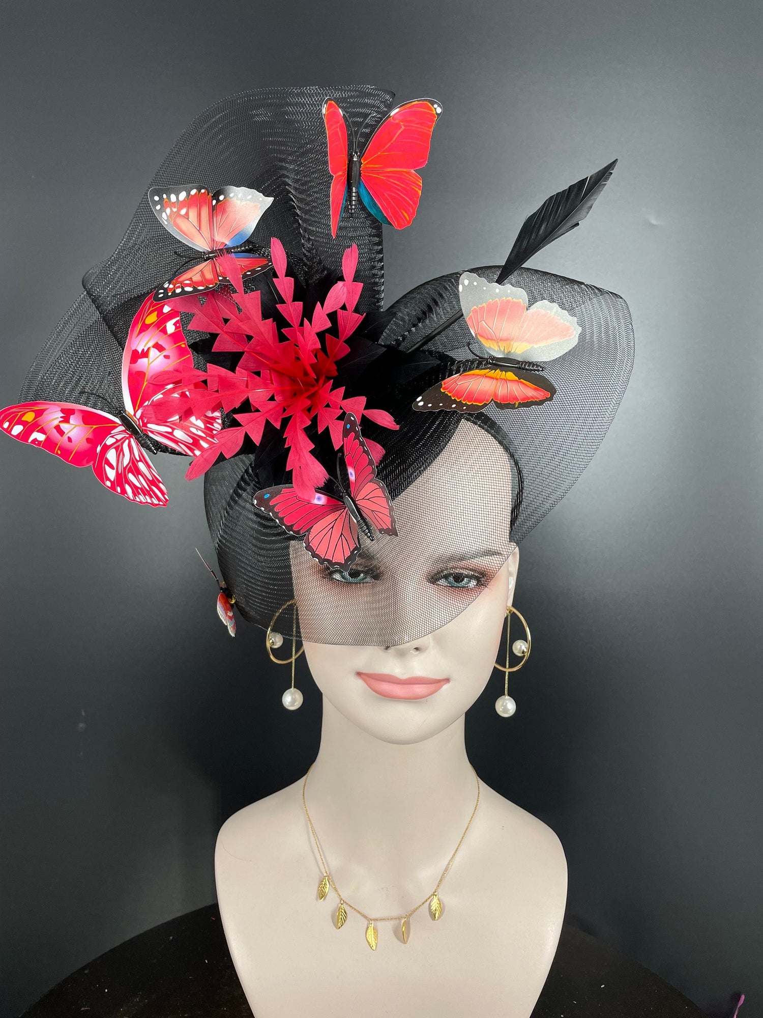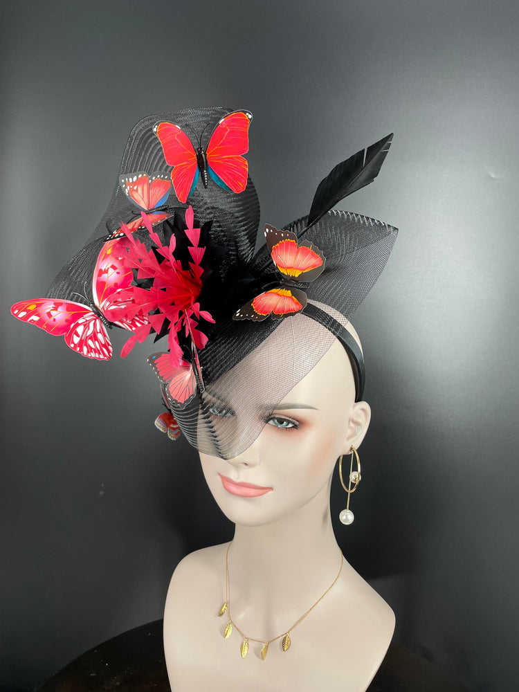 Kentucky Derby Fascinator Hat: Black Organza, Red Feather, Butterfly Headband