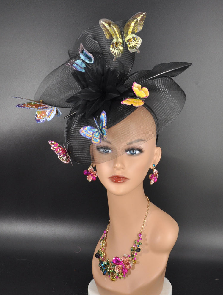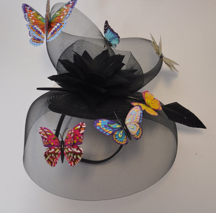 Kentucky Derby Wedding Feather w Butterflies Floral Organza w Sinamay Headband Fascinator Hat Cocktail Black