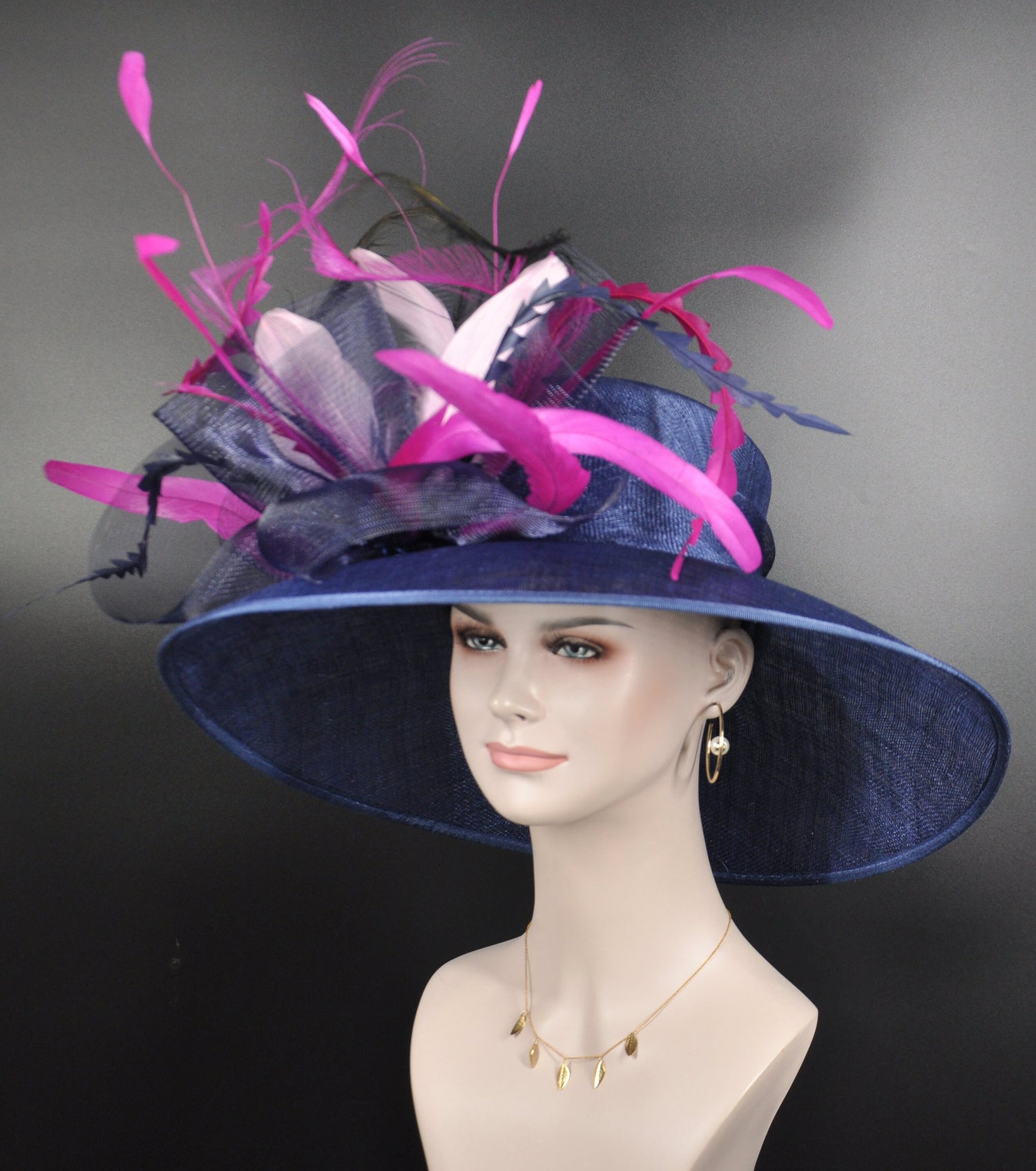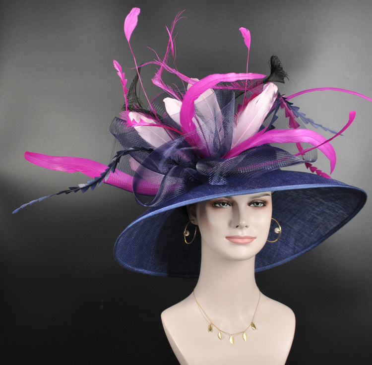 Kenutucky Derby Hat, Wide Brim Sinamay Hat, Tea Party Hat, Oaks Day Hat, Wedding Hat Navy Blue Fuchsia Pink Light Pink Jumbo Bows Hat