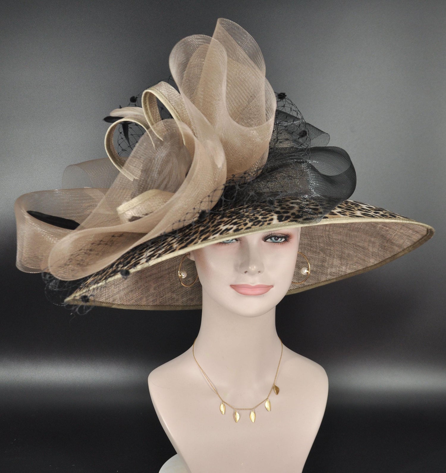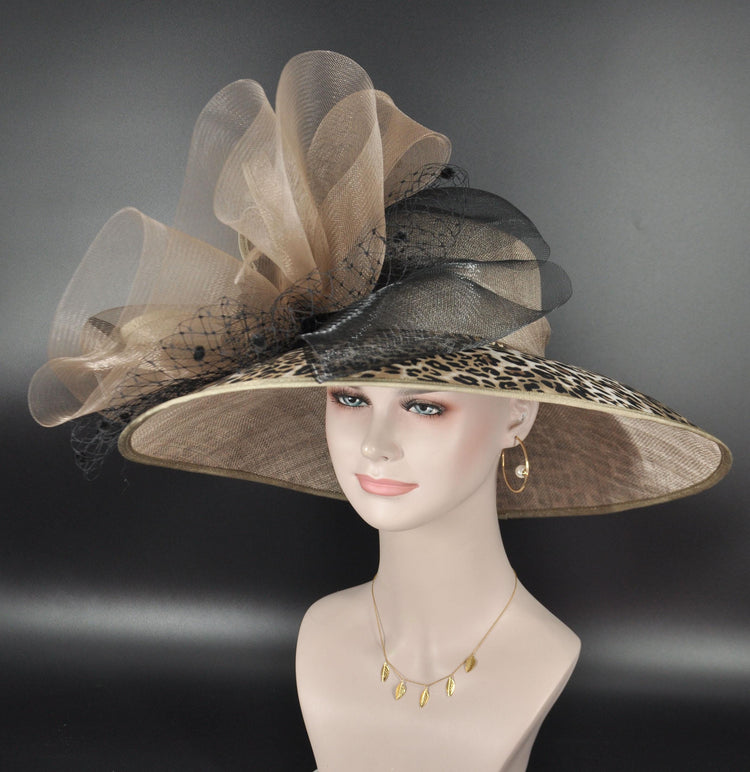 Unleash your wild side with this striking leopard print wide-brim Derby hat! Designed for those who love to stand out, this exquisite hat features a bold animal print complemented by a sophisticated taupe sinamay crown. A dramatic black and tan bow, adorned with delicate netting and subtle black accents, adds the perfect finishing touch.
