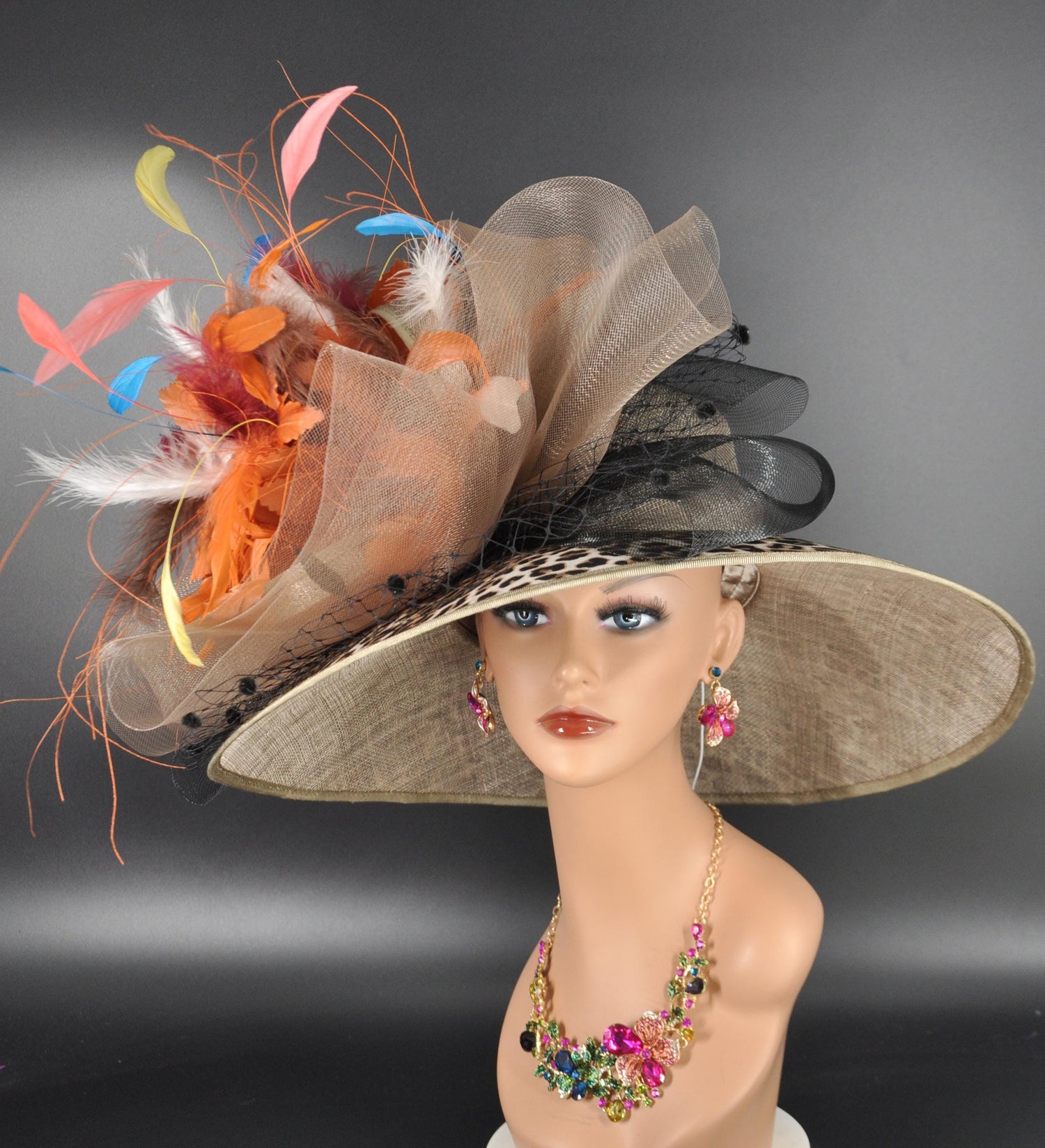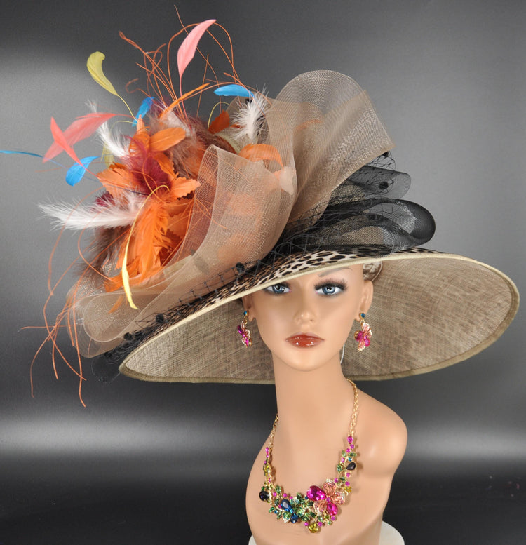 Leopard Print Kentucky Derby Hat: Taupe Sinamay Wide Brim