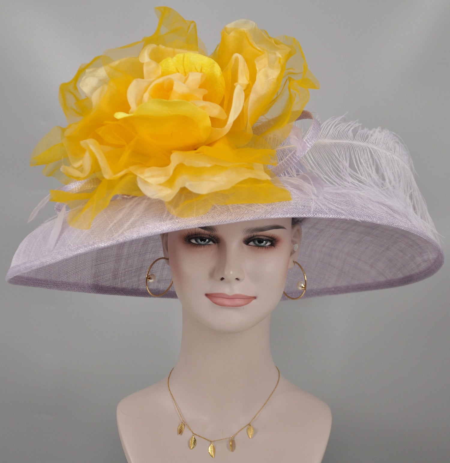 Lilac Sinamay Kentucky Derby Hat: Yellow Silk Flower, Ostrich Feather