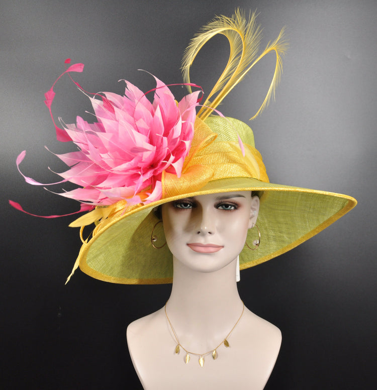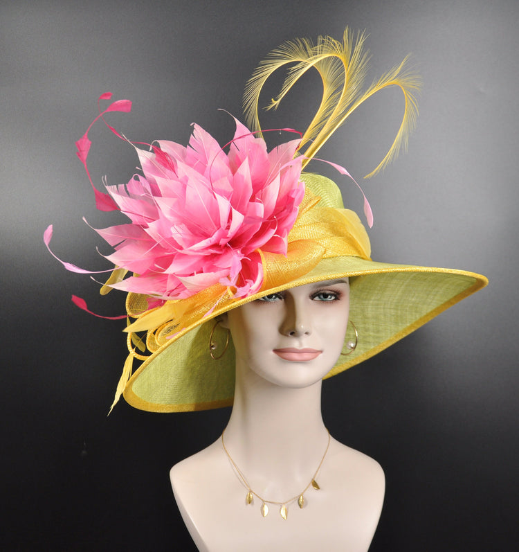 Lime Green Lemon Yellow Pink Wide Brim Sinamay Hat Church Kentucky Derby Hat Tea Party Wedding Royal Ascot Hat Horse Race Oaks day hat