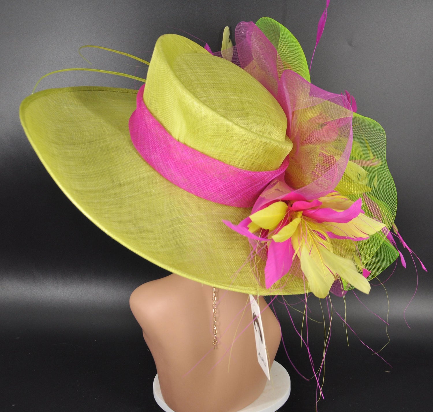 Lime Green Sinamay Kentucky Derby Hat: Fuchsia Pink Feather Wedding Hat