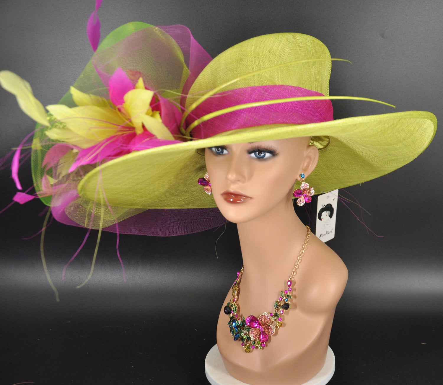 Have questions? Feel free to reach out—we’re happy to help!This stunning Kentucky Derby hat is a true showstopper, crafted from sinamay in a captivating shade of green. The wide, sweeping brim exudes elegance, while delicate layers of translucent sinamay fabric create a voluminous and airy effect. A dramatic arrangement of hand-curled feathers in various shades of Lime Green with Fuchsia Pink movement and flair, forming an eye-catching floral-inspired focal point. Subtle crystal embellishments add a touch of sparkle, catching the light with every turn of the head. The hat's intricate design combines vintage sophistication with modern drama, making it the perfect statement piece for the Kentucky Derby, weddings, garden parties, or any formal event where elegance is key.