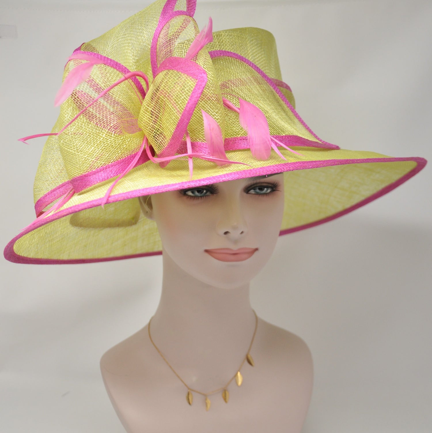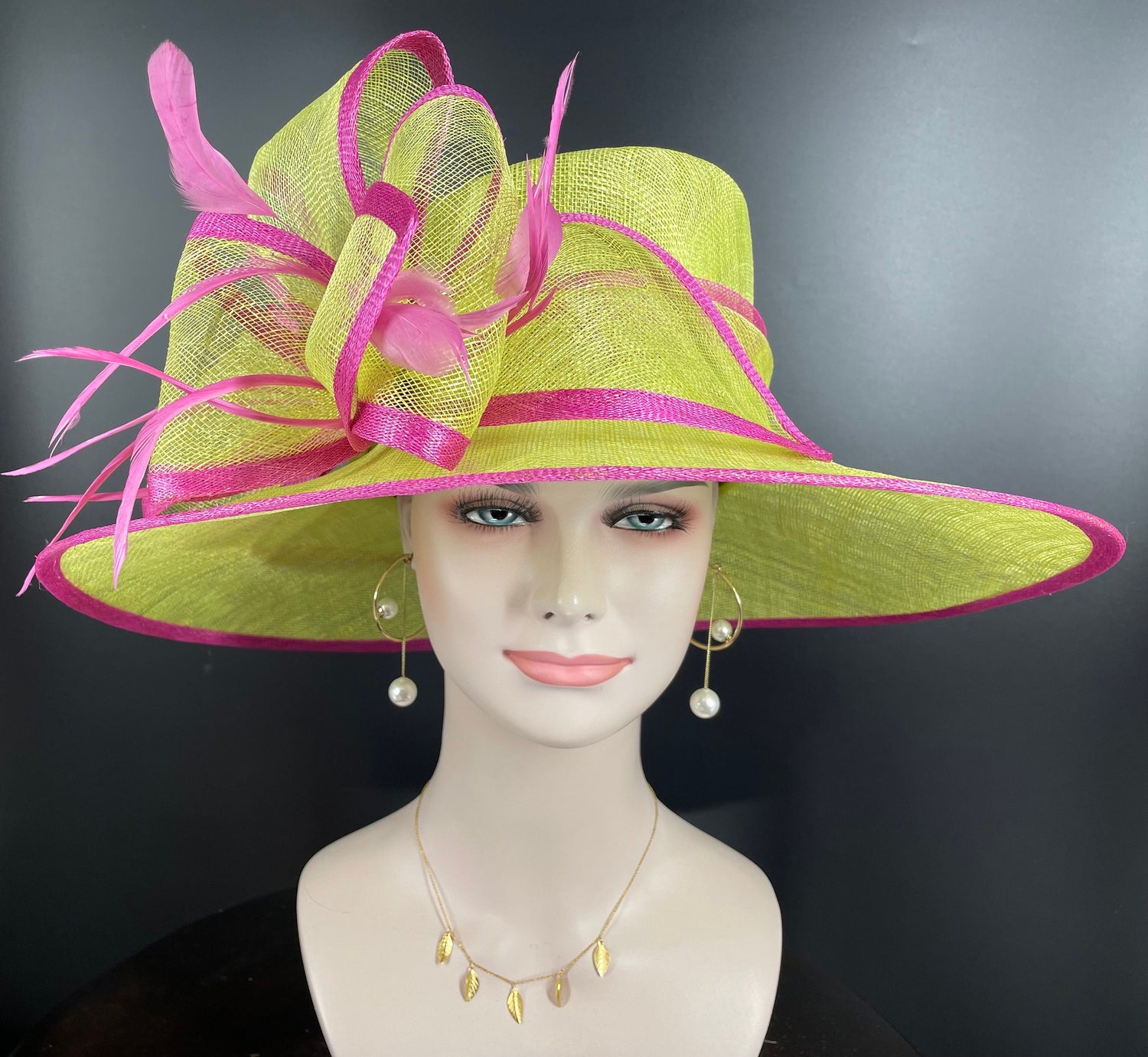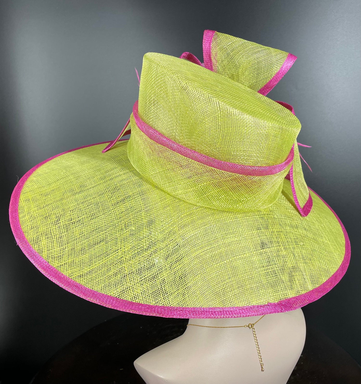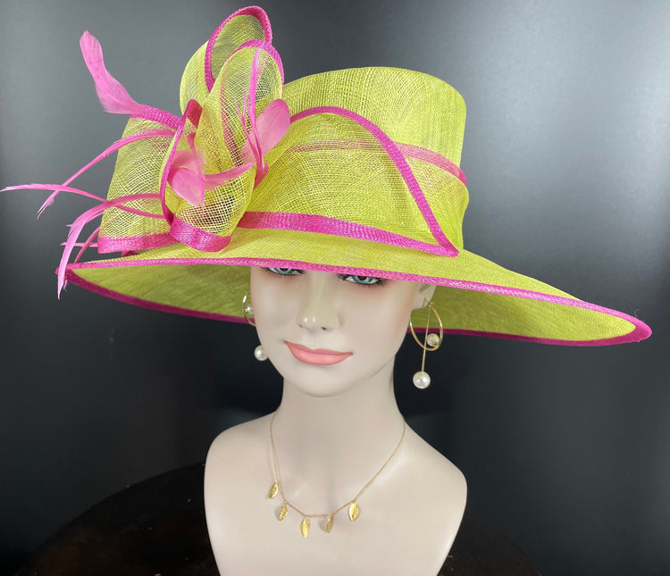 Lime Green Sinamay Kentucky Derby Hat: Hot Pink Feather Flower Wide Brim
