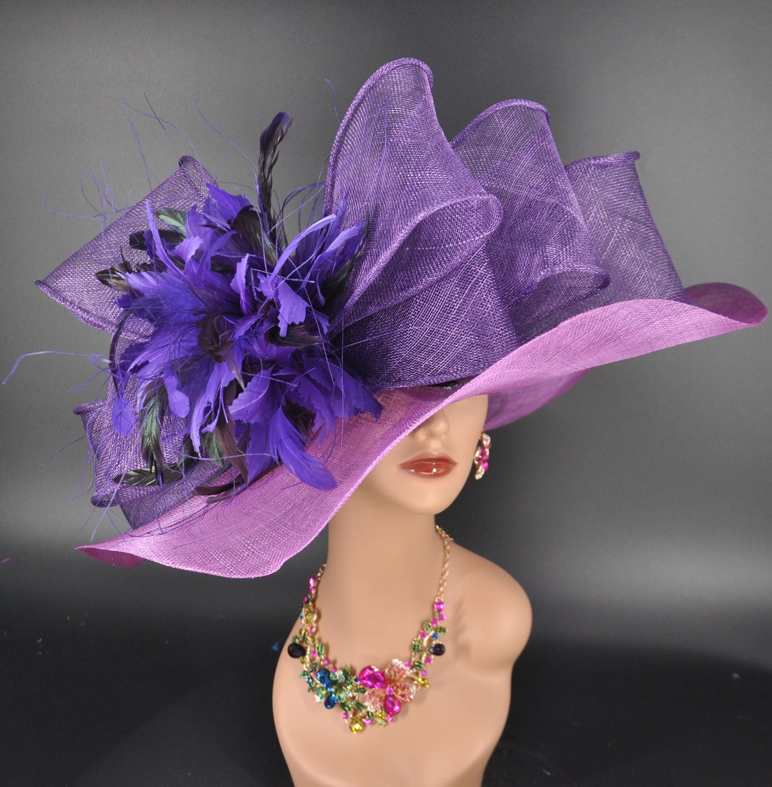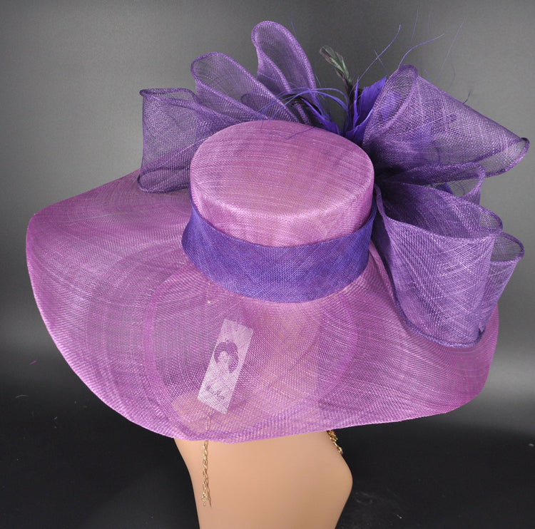 Mix Purple Wide-Brim Sinamay Hat Feather Flower,Powder Blue Bows Elegant Statement Design Perfect for Kentucky Derby Party Formal Events